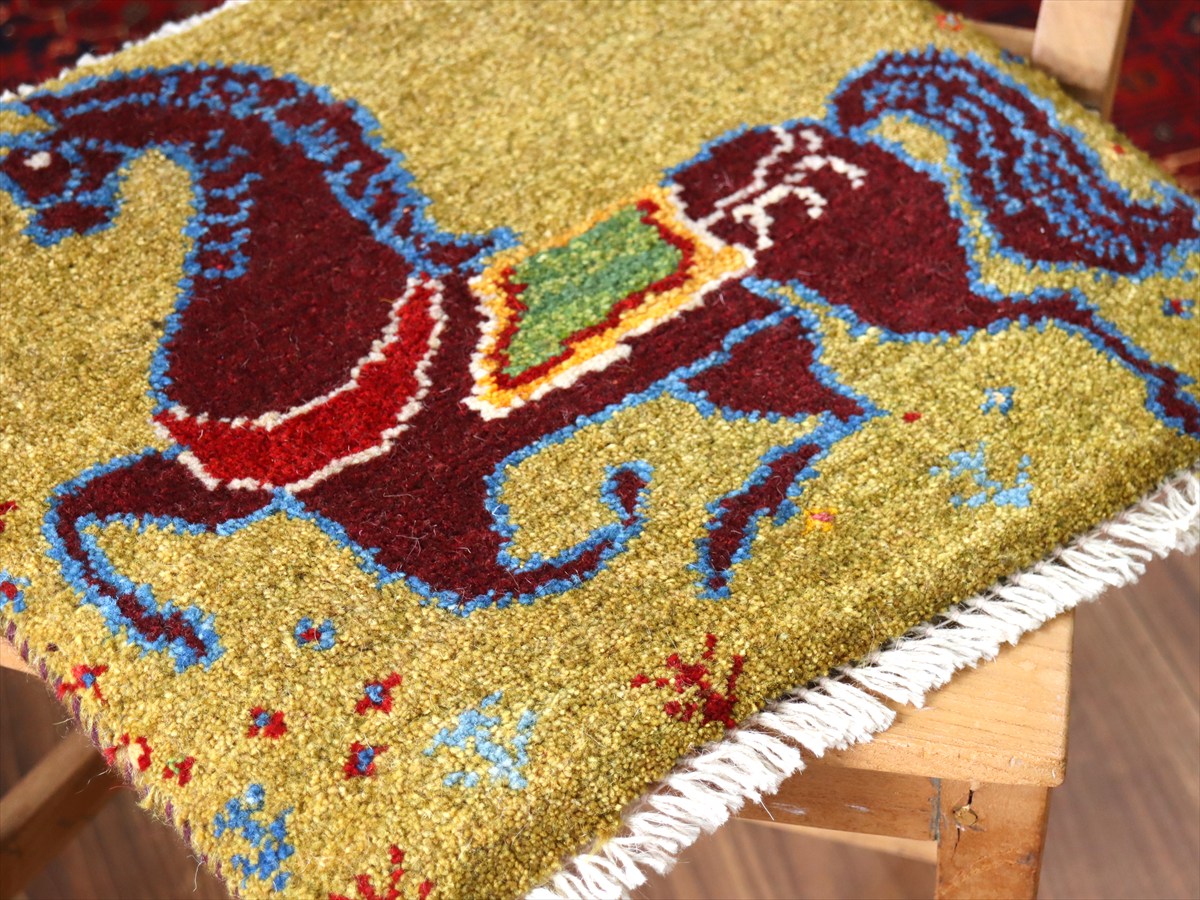 ギャッベ イラン産手織り 座布団サイズ41×44cm モスグリーン 躍動する馬
