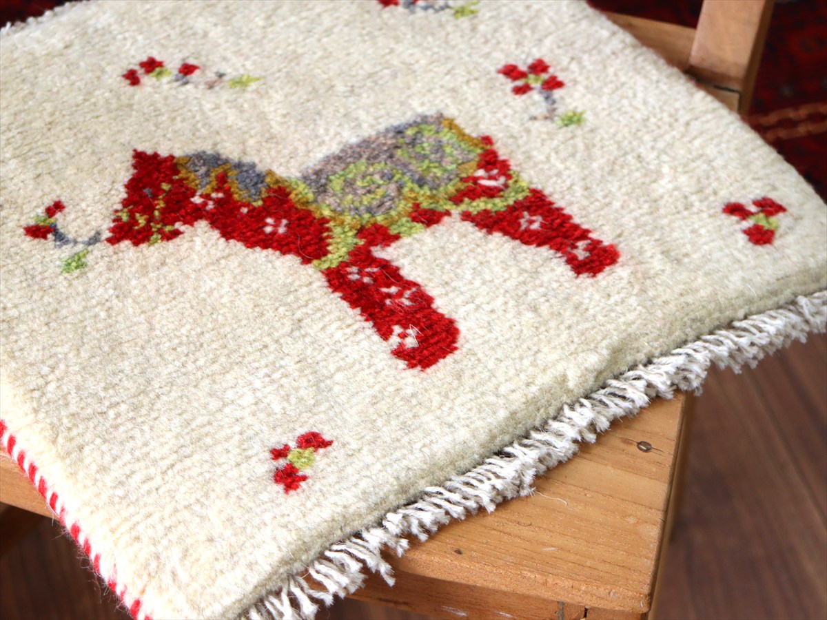 ギャッベ イラン産手織り 座布団サイズ37×38cm ナチュラルアイボリー フラワーと馬