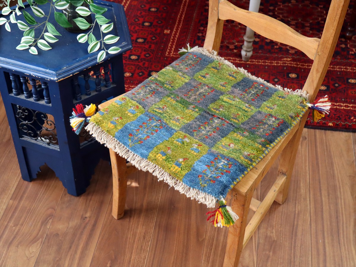 ギャッベ イラン産手織り 座布団サイズ40×38cm カラフルタイル 動物と生命の木