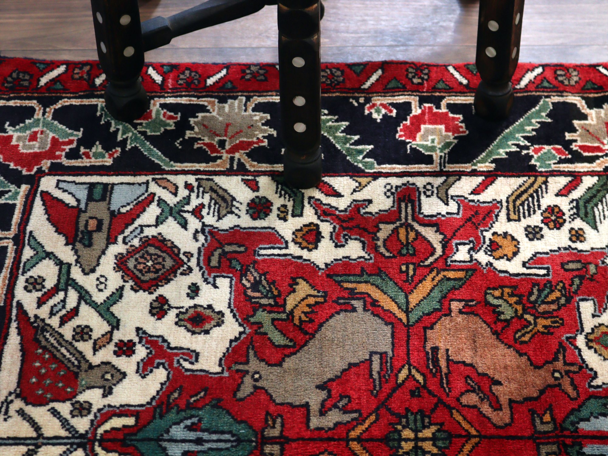 | センターはアイボリーベースに動物が織られた花形のメダリオン、額縁部分にはネイビーに花が連なるように織られたデザイン。鳥もデザインに馴染むように織られているようです。 |