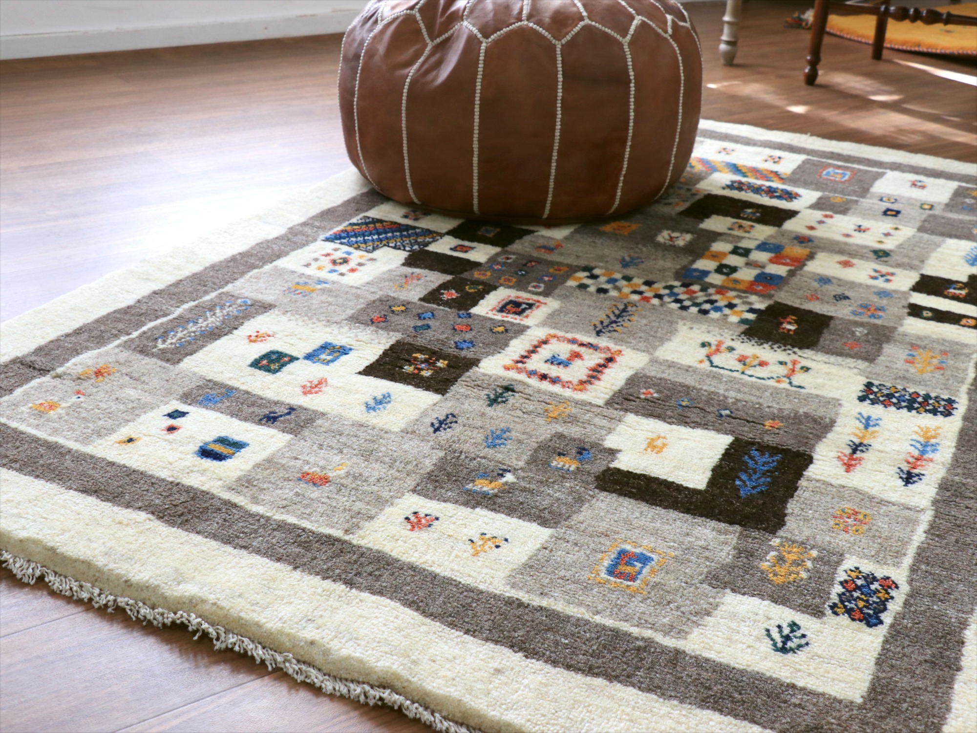 ギャッベ イラン産 手織りラグ 123x83cm モザイクのようなタイル柄 グレー ナチュラル モノトーン