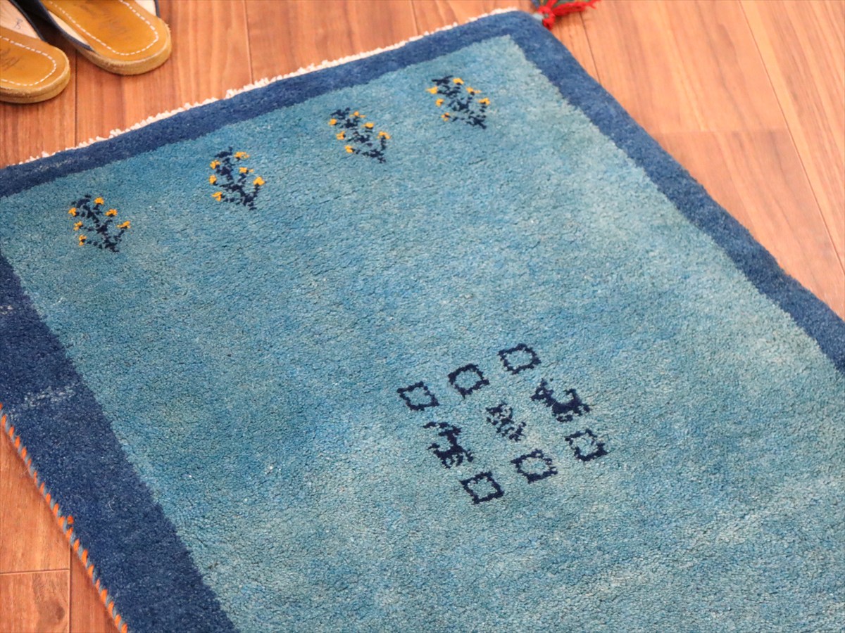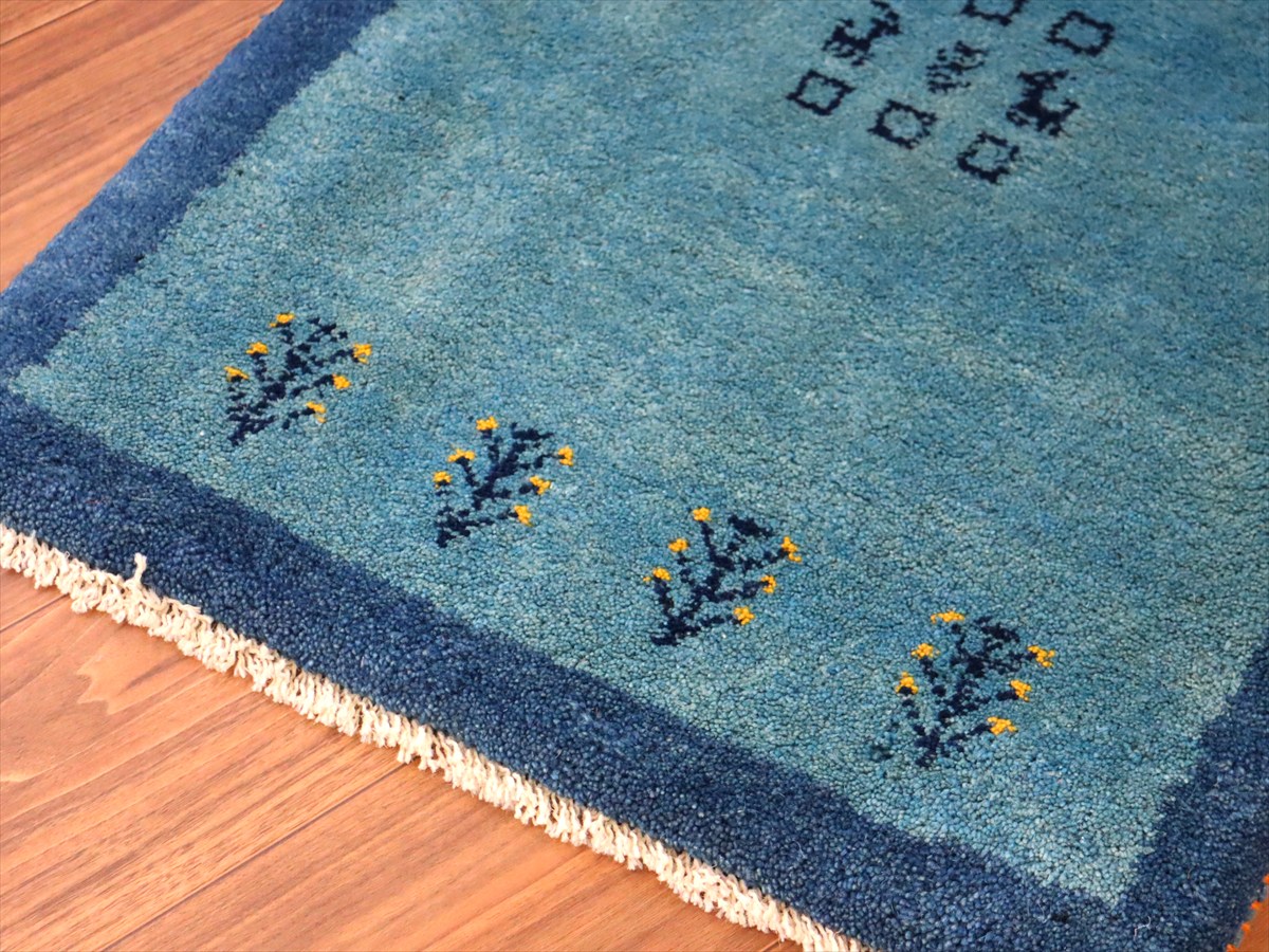 ギャッベ イラン産手織り 88×60cm 玄関マット ブルー 向かい合う動物と生命の樹