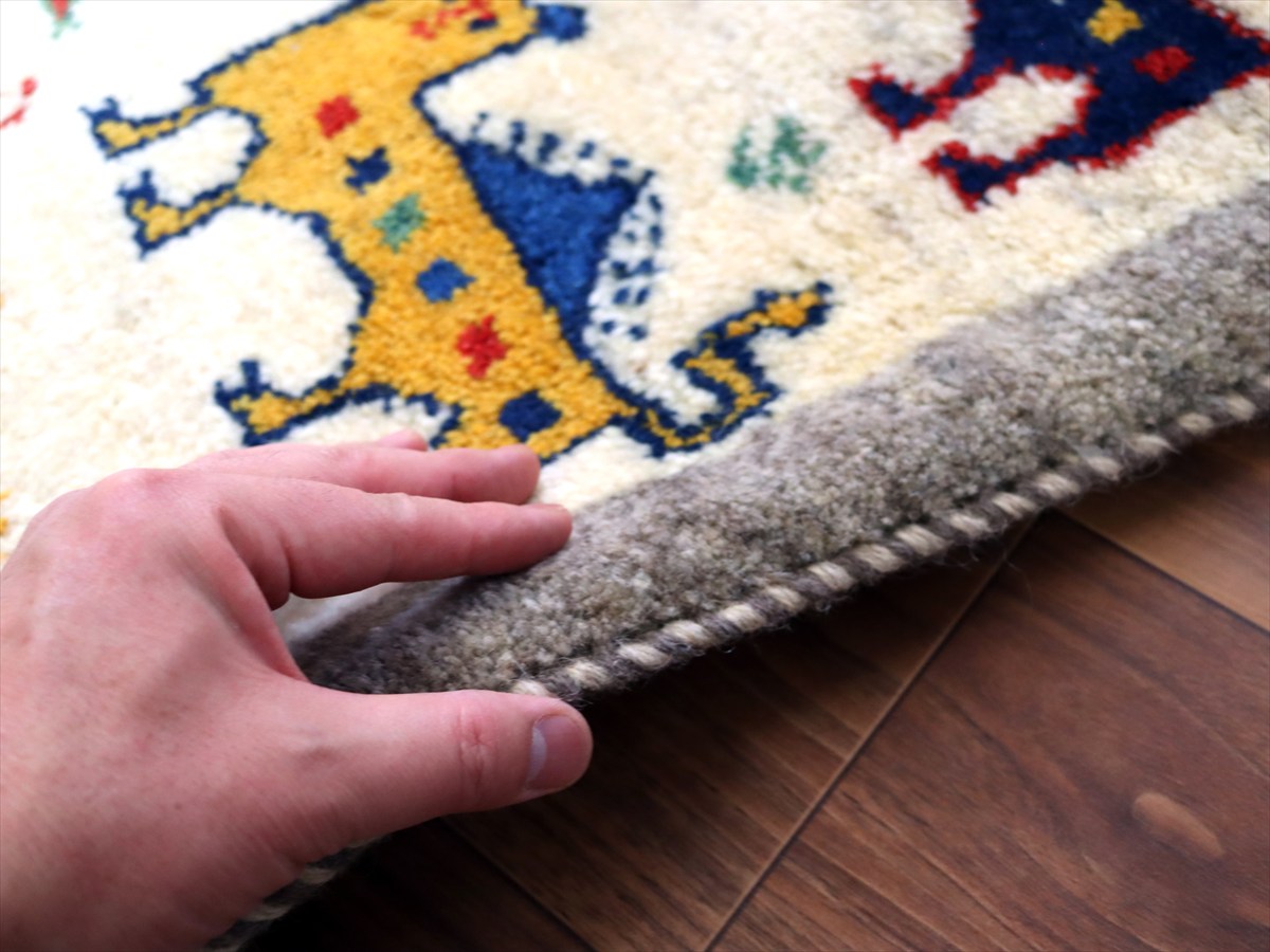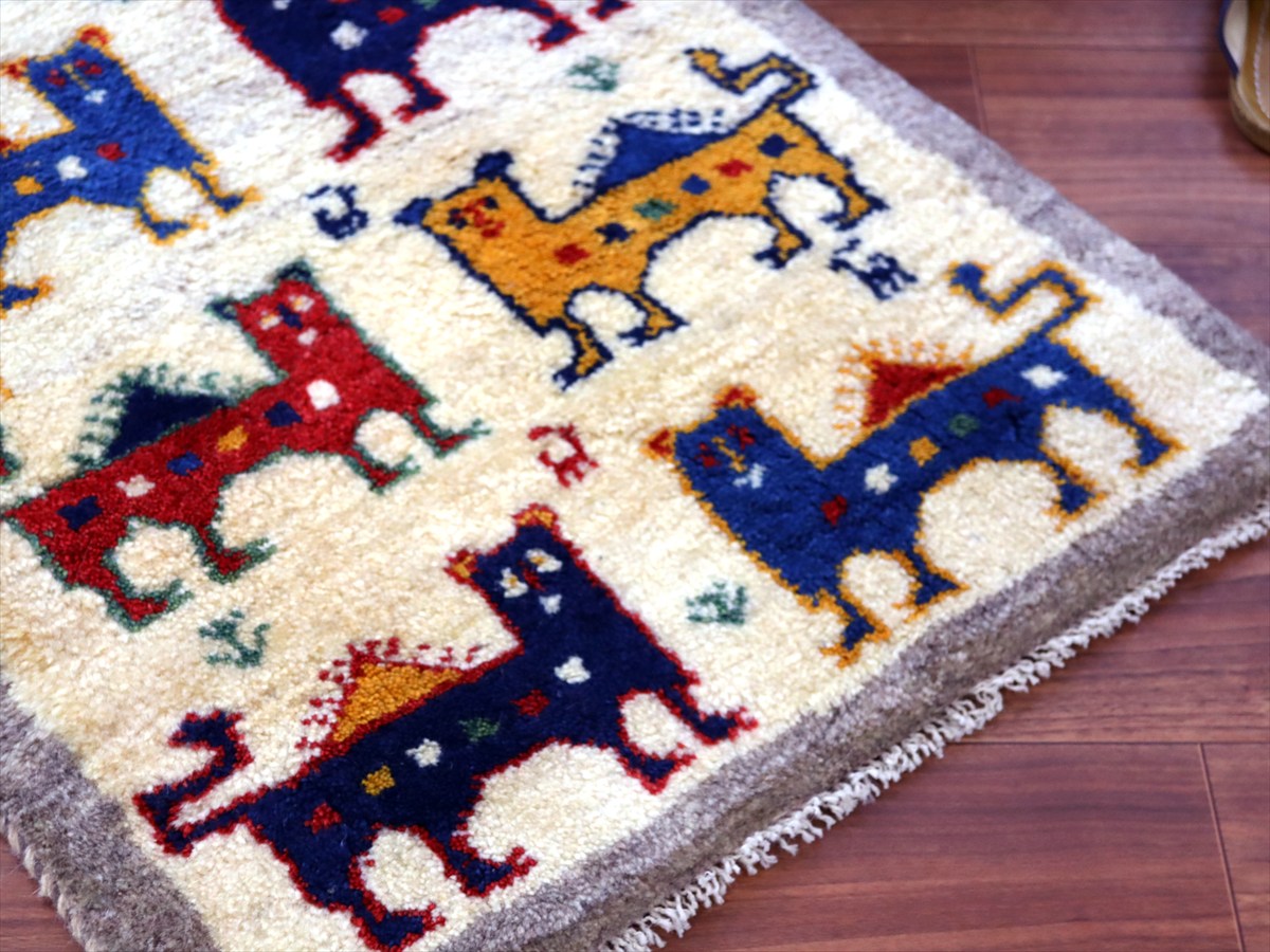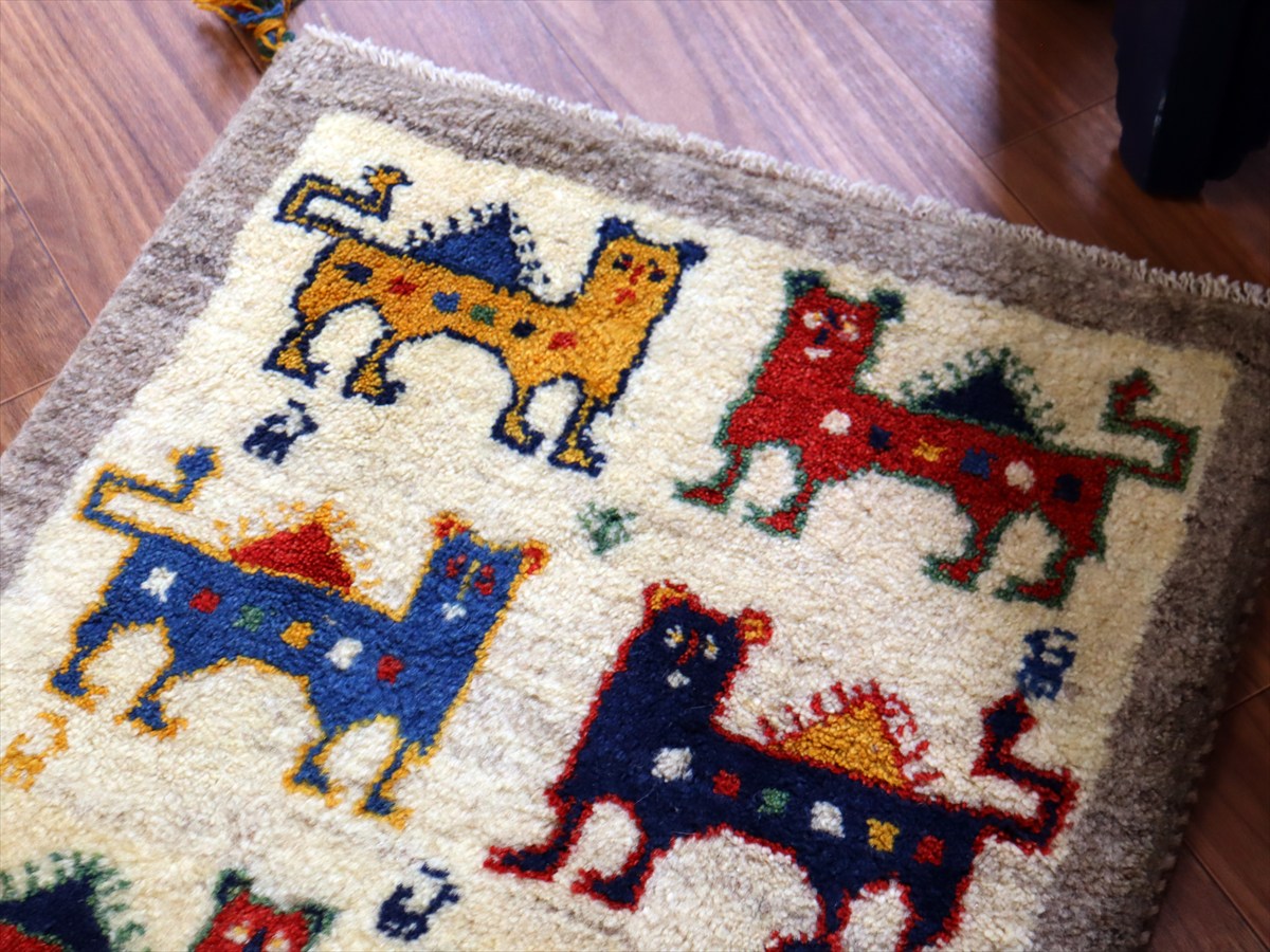 ギャッベ イラン産手織り 86×62cm 玄関マット ナチュラルアイボリー カラフルなライオン