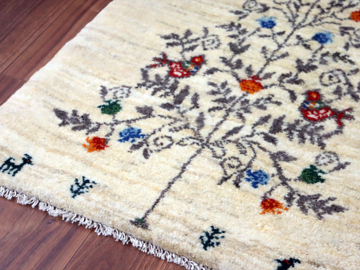 - ギャッベ イラン産手織り 91×65cm 玄関マット ナチュラルアイボリー 生命の樹と鳥とザクロ