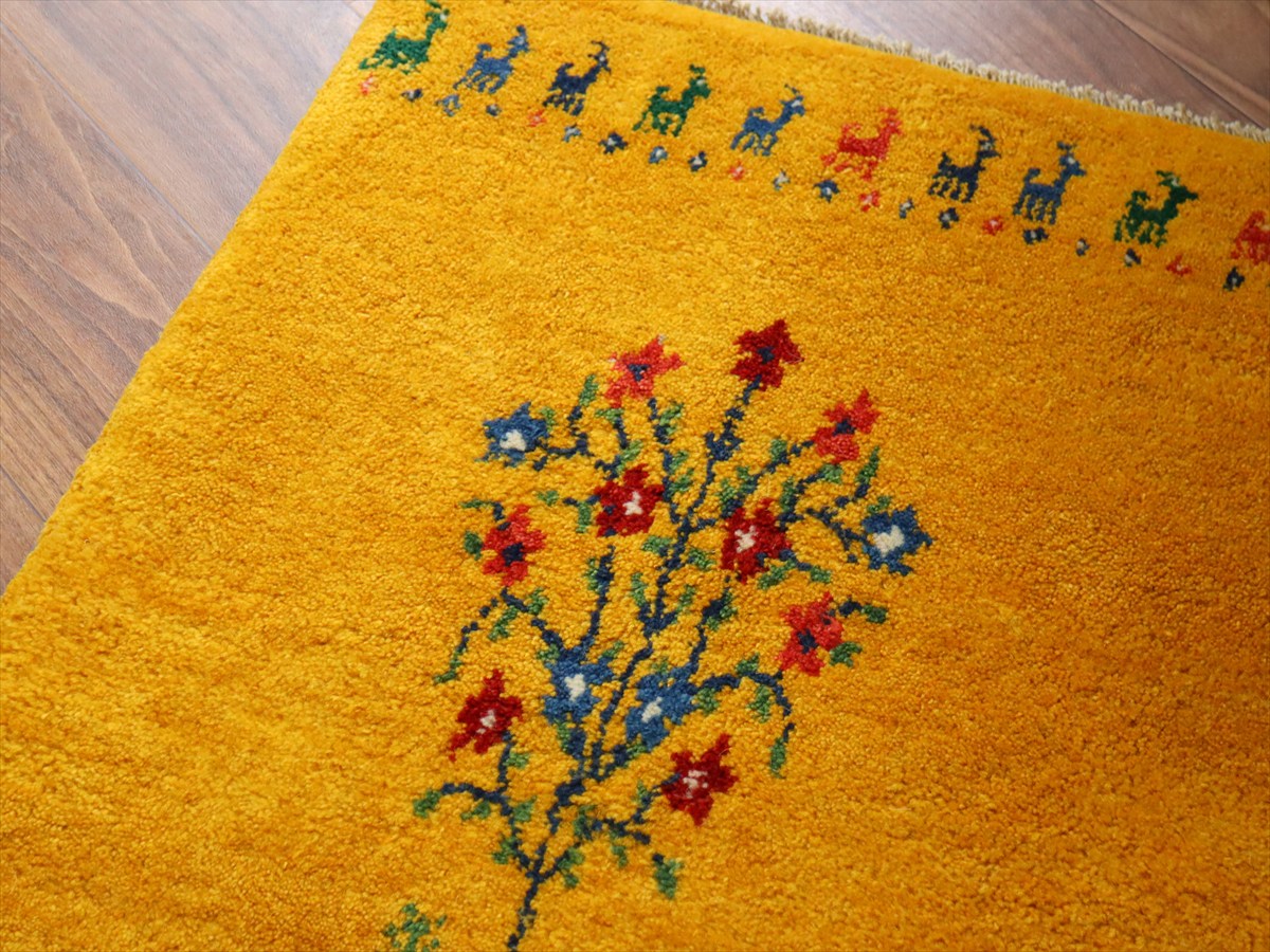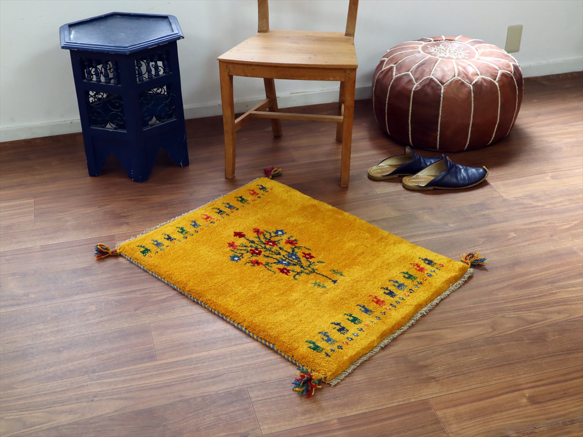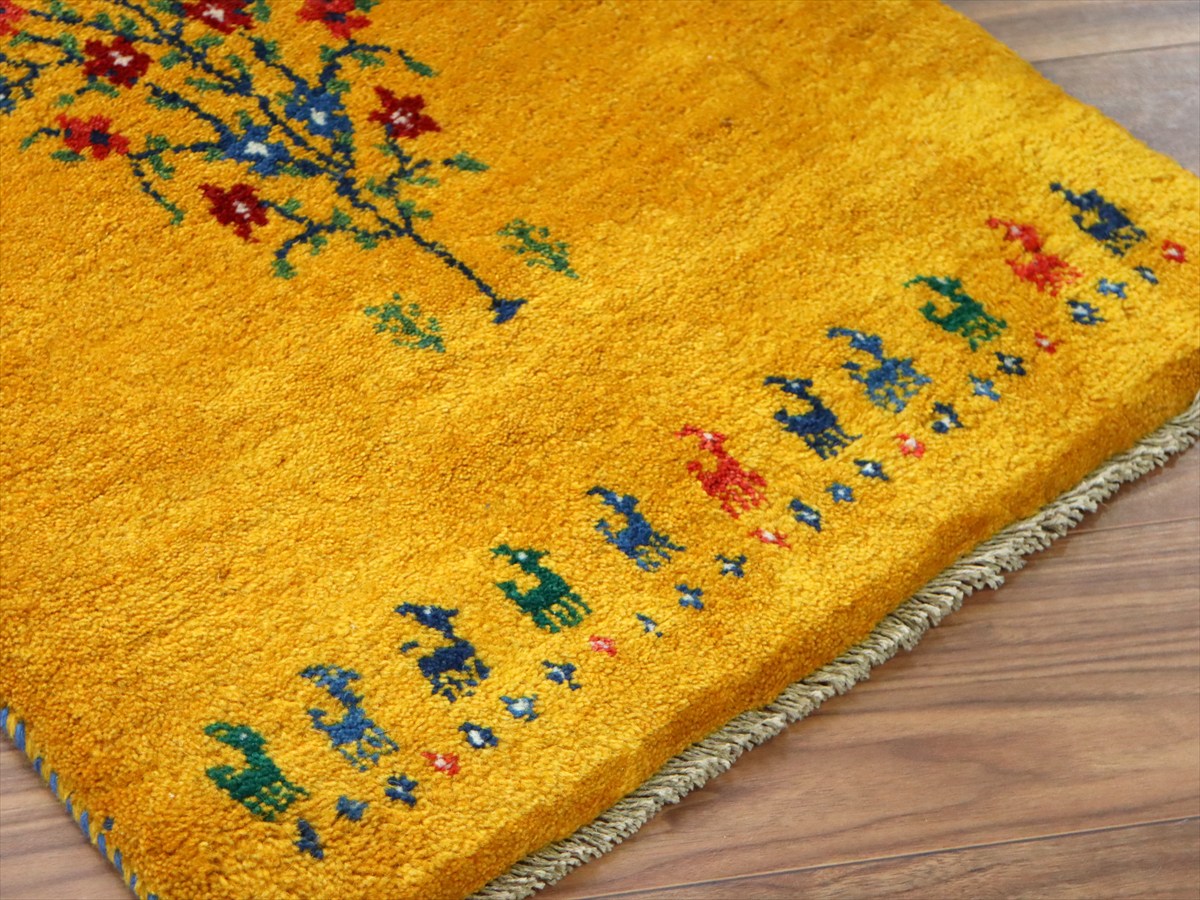 - ギャッベ イラン産手織り 82×62cm 玄関マット イエロー 生命の樹と動物モチーフ