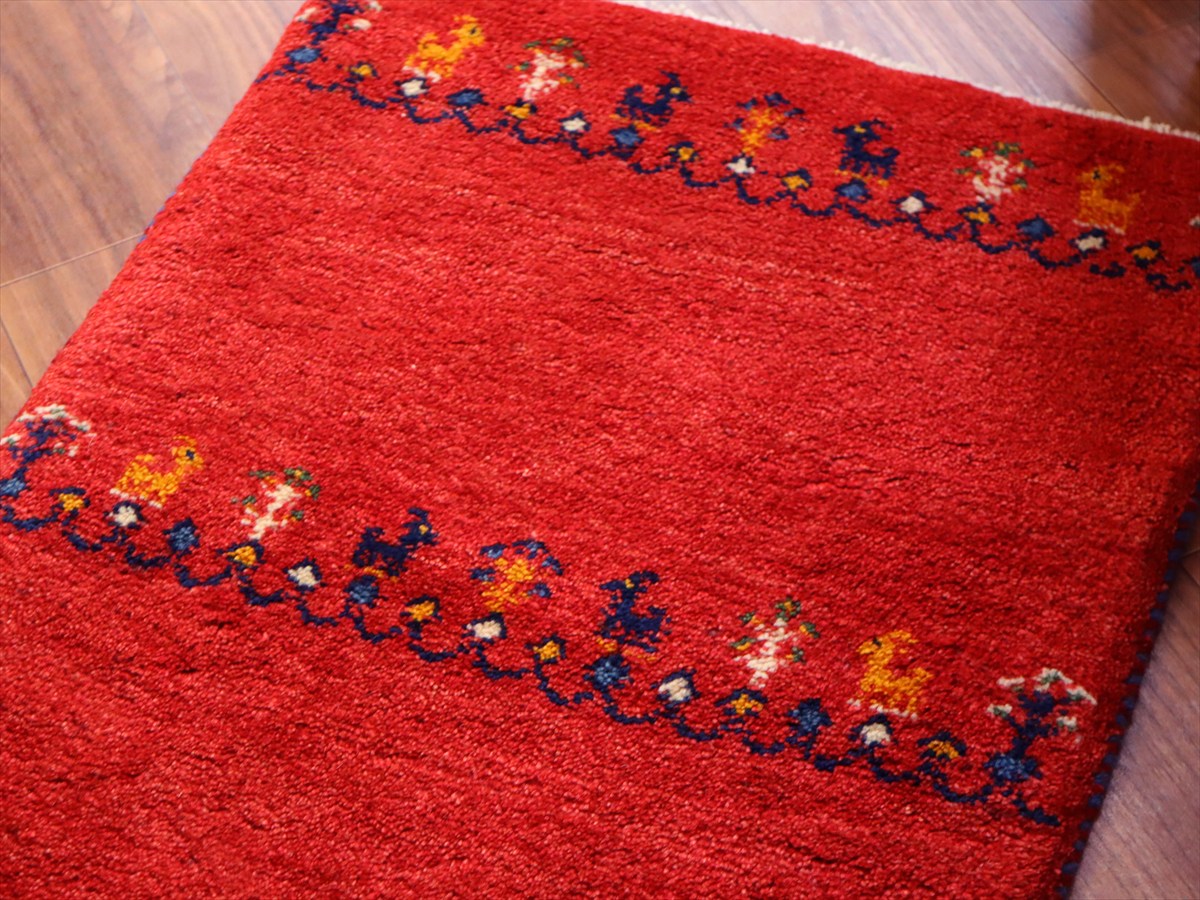 ギャッベ イラン産手織り 83×60cm 玄関マット レッド カラフルな動物と生命の樹