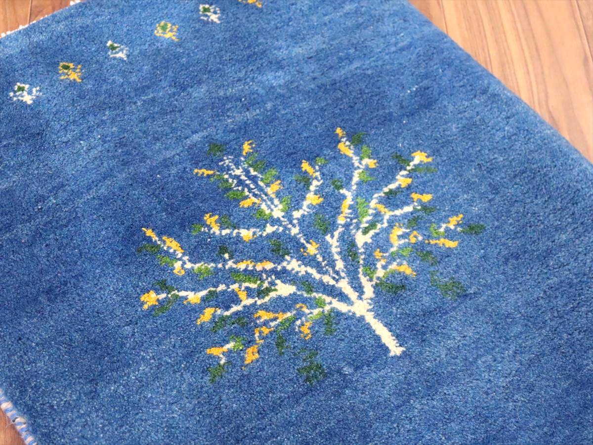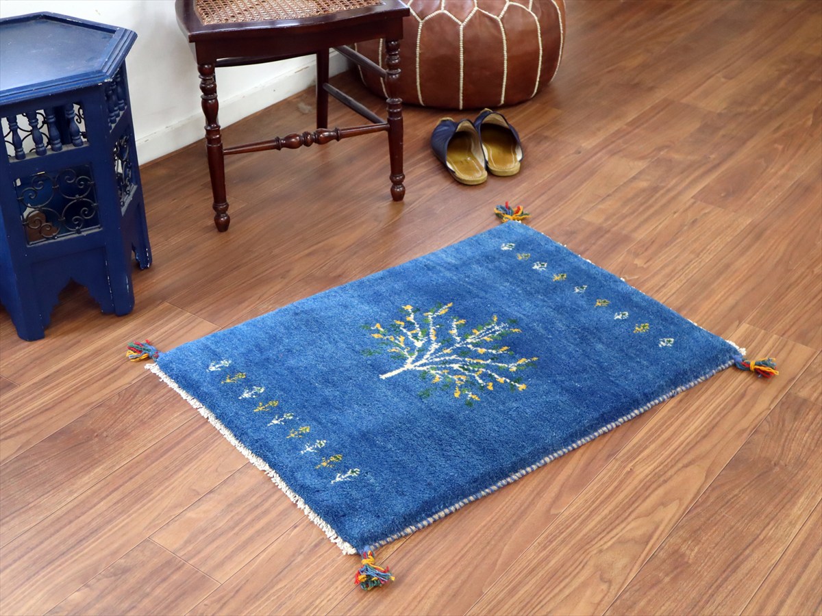 ギャッベ イラン産手織り 87×62cm 玄関マット ブルー 生命の樹