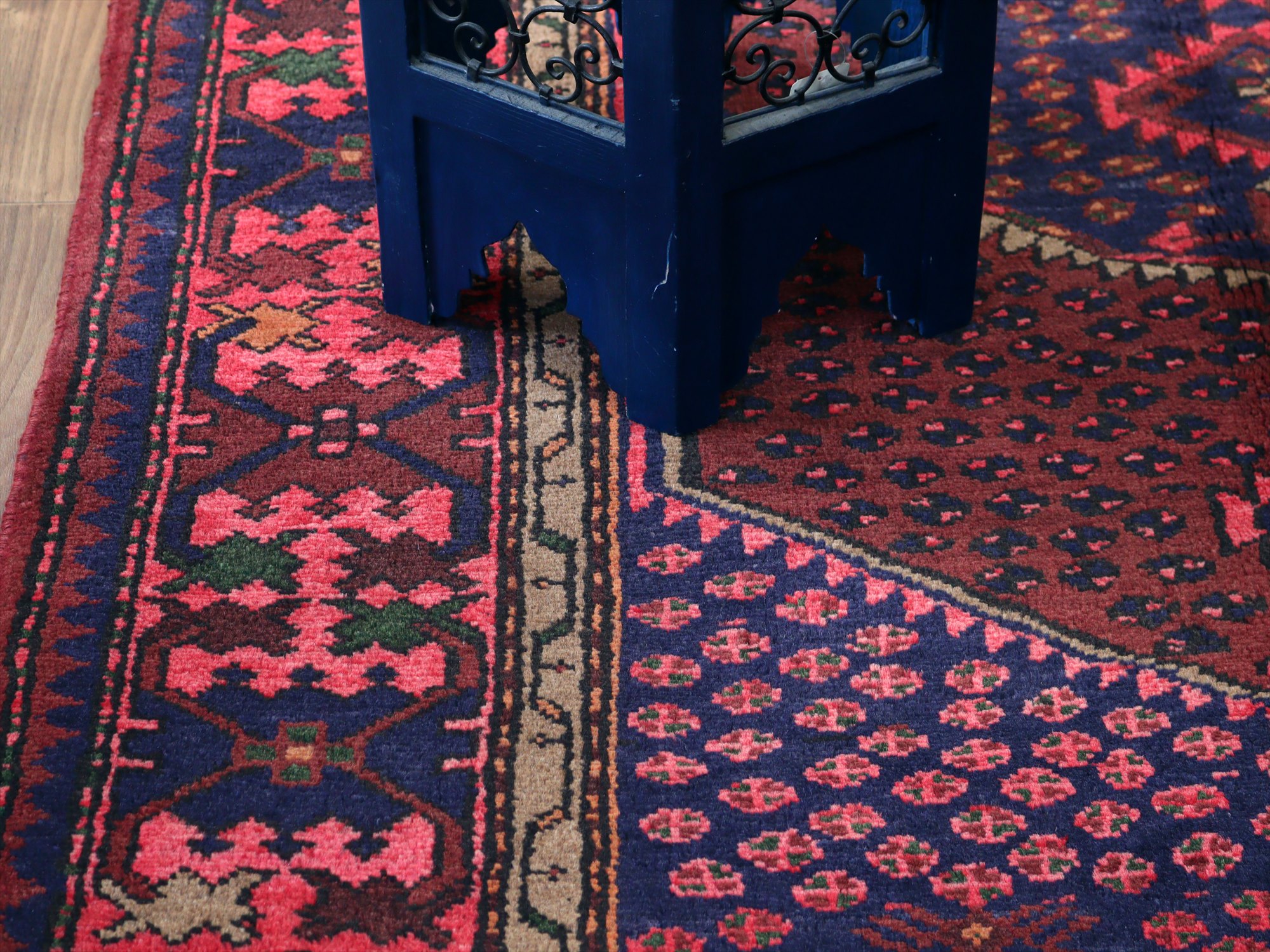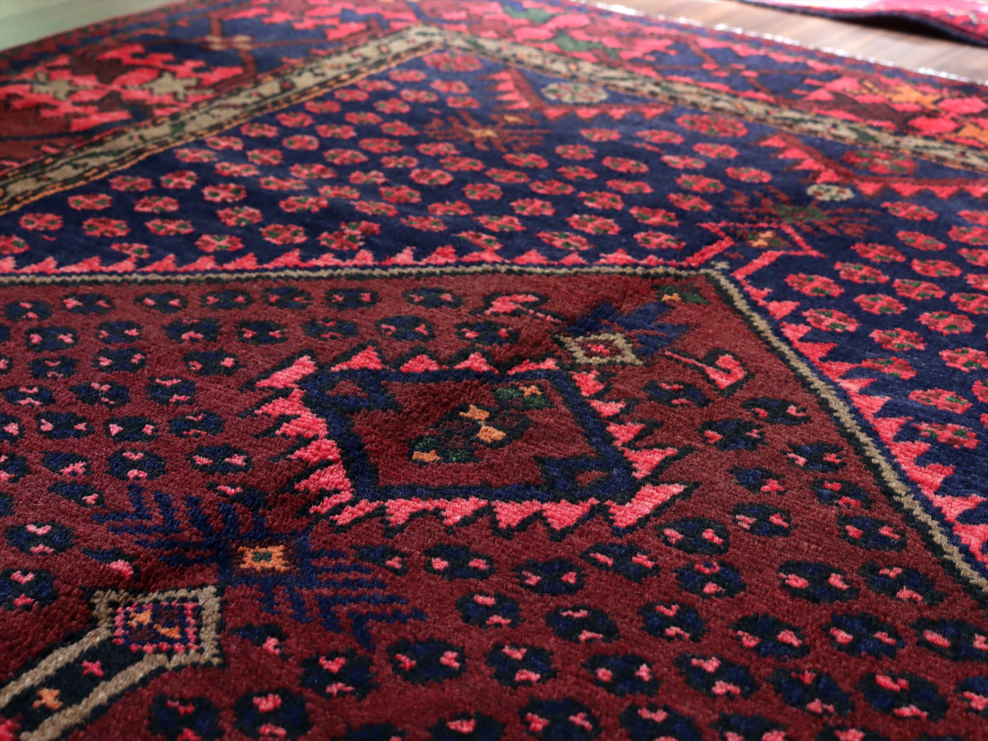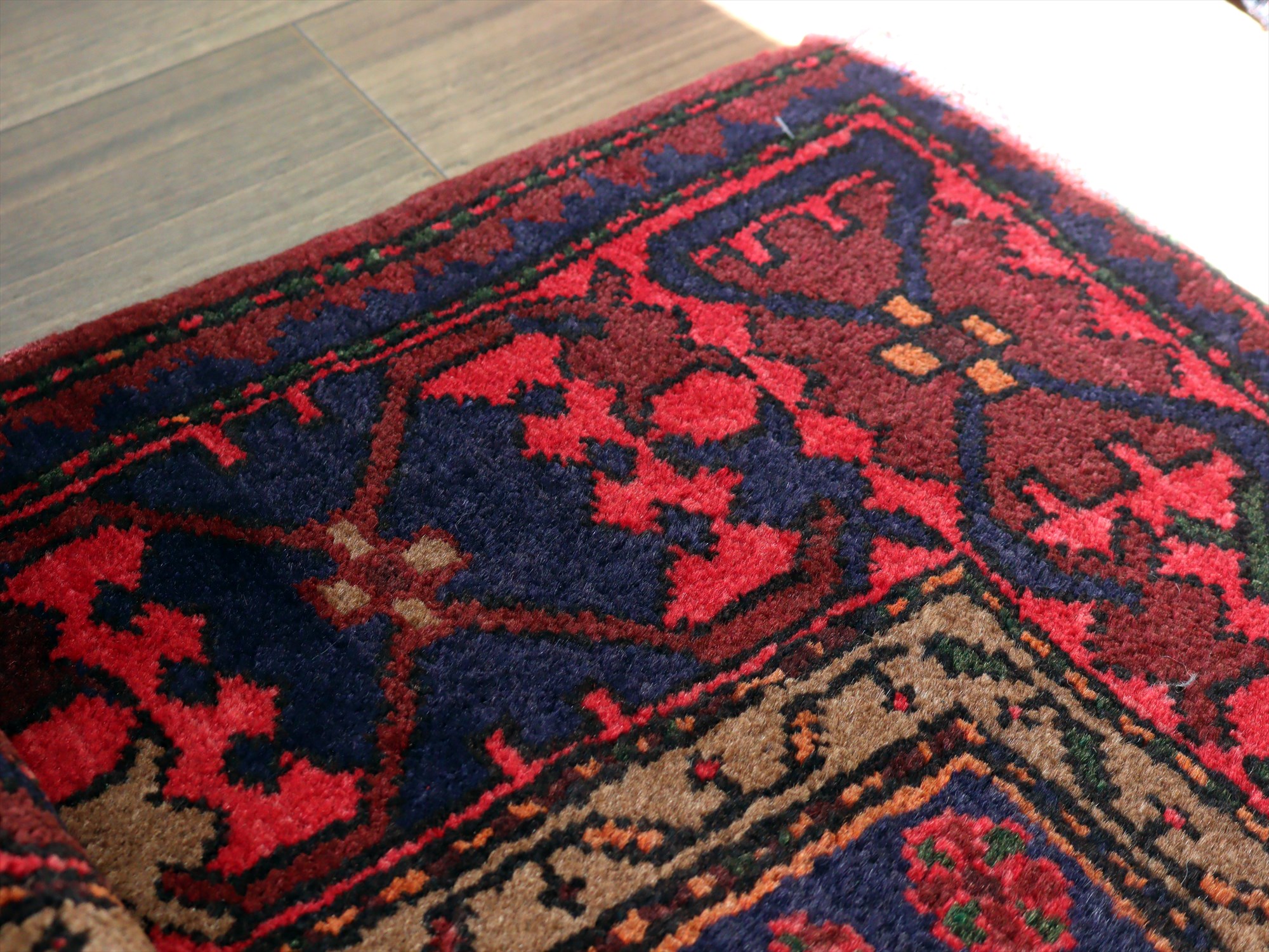 | イランの首都テヘランから西へ300kmほど離れたハマダン地方ハルシンで織られたカーペットです。曲線で描かれた花模様の華やかなペルシャじゅうたんと異なり、直線的な幾何学モチーフで構成された落ち着いたイメージ。トーンの異なる赤とコバルトブルーはこの地方の伝統的な色使い。トライバルラグのあたたかみのある雰囲気が楽しめる一枚です。 |