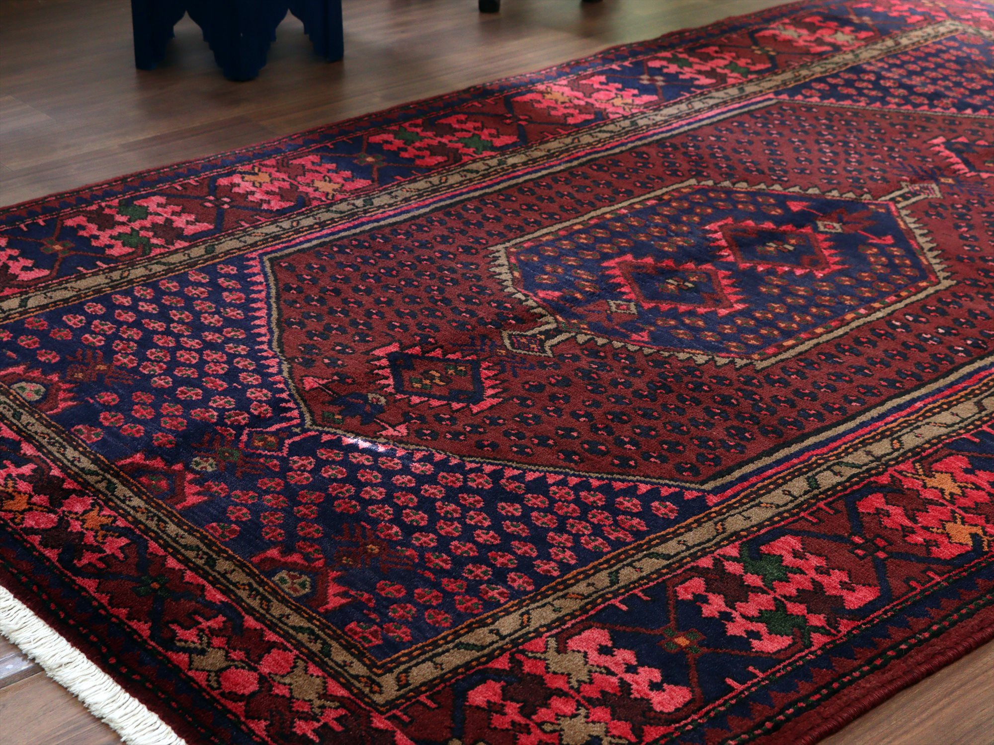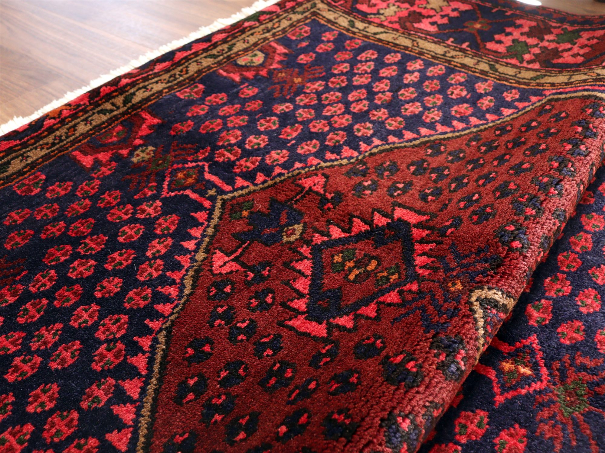 イランの手織り絨毯 ハマダン229×145cm 六角メダリオン レッド&ネイビー