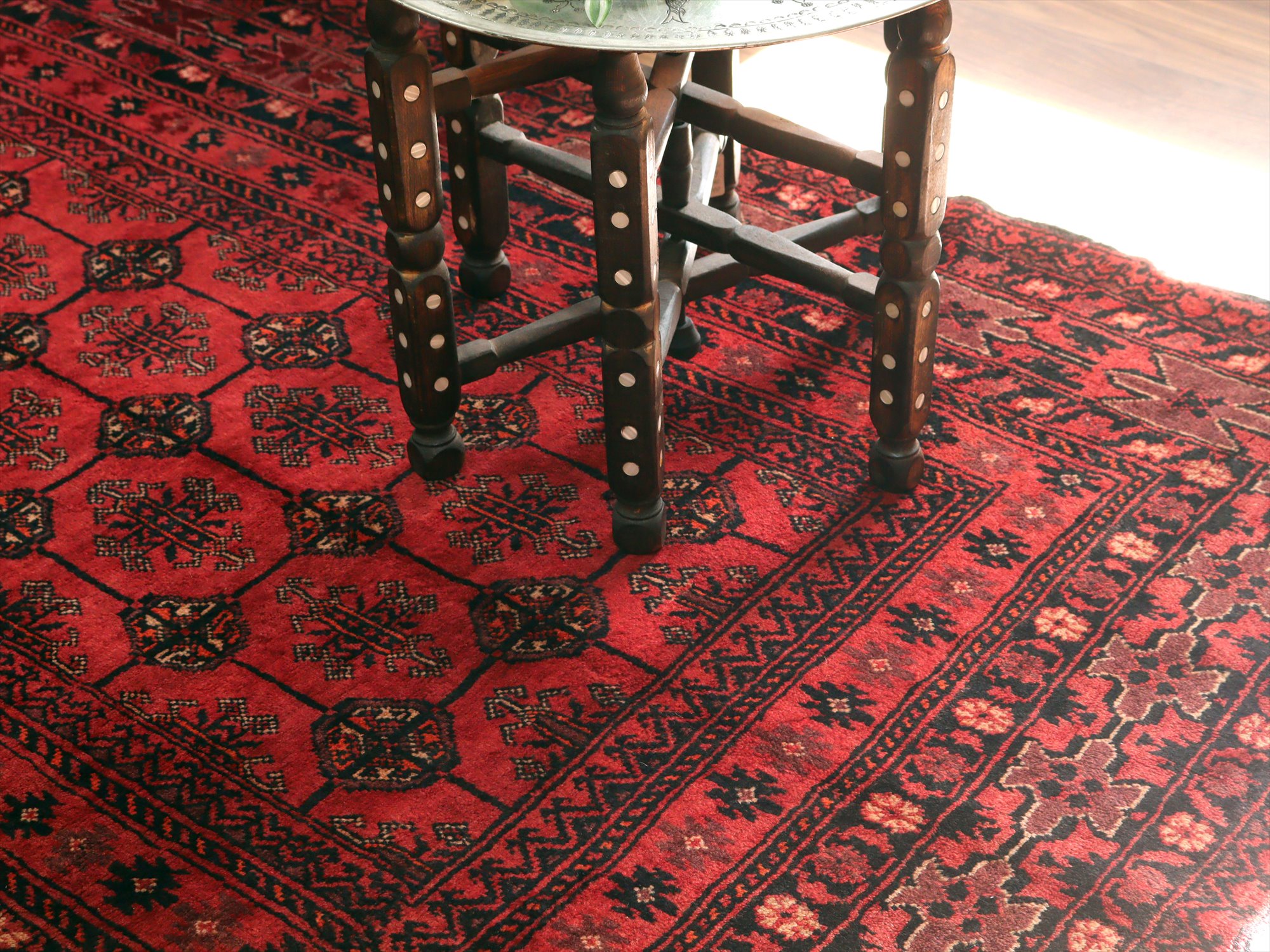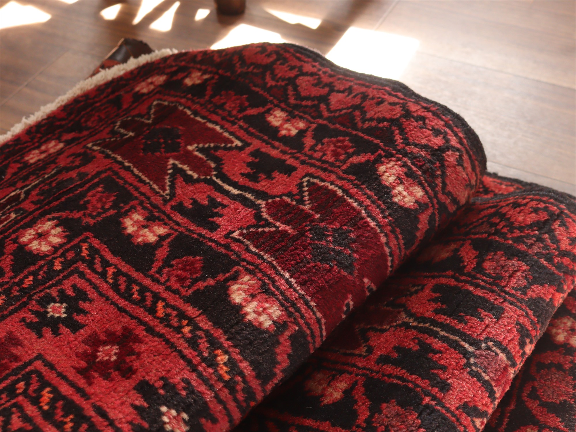 | イラン東部からアフガン・パキスタンなどに住むバルーチ族のカーペット。赤地にギュルのモチーフが入ったバルーチの典型的なデザインです。 |