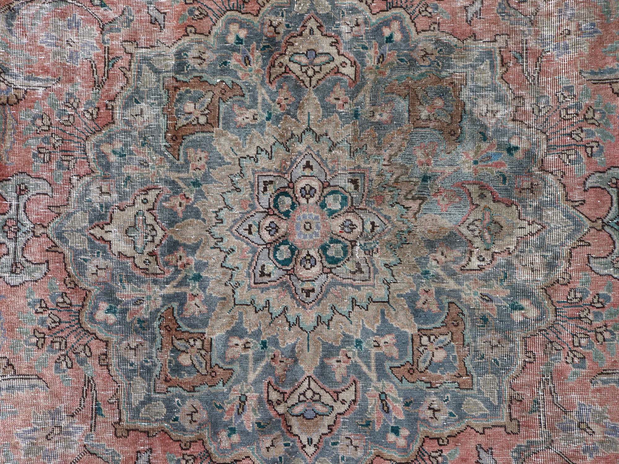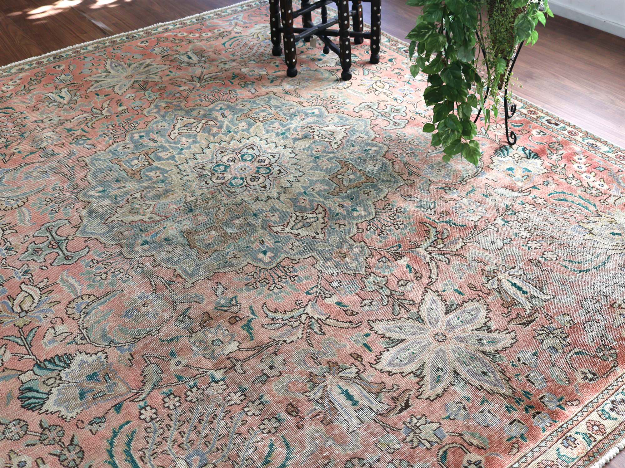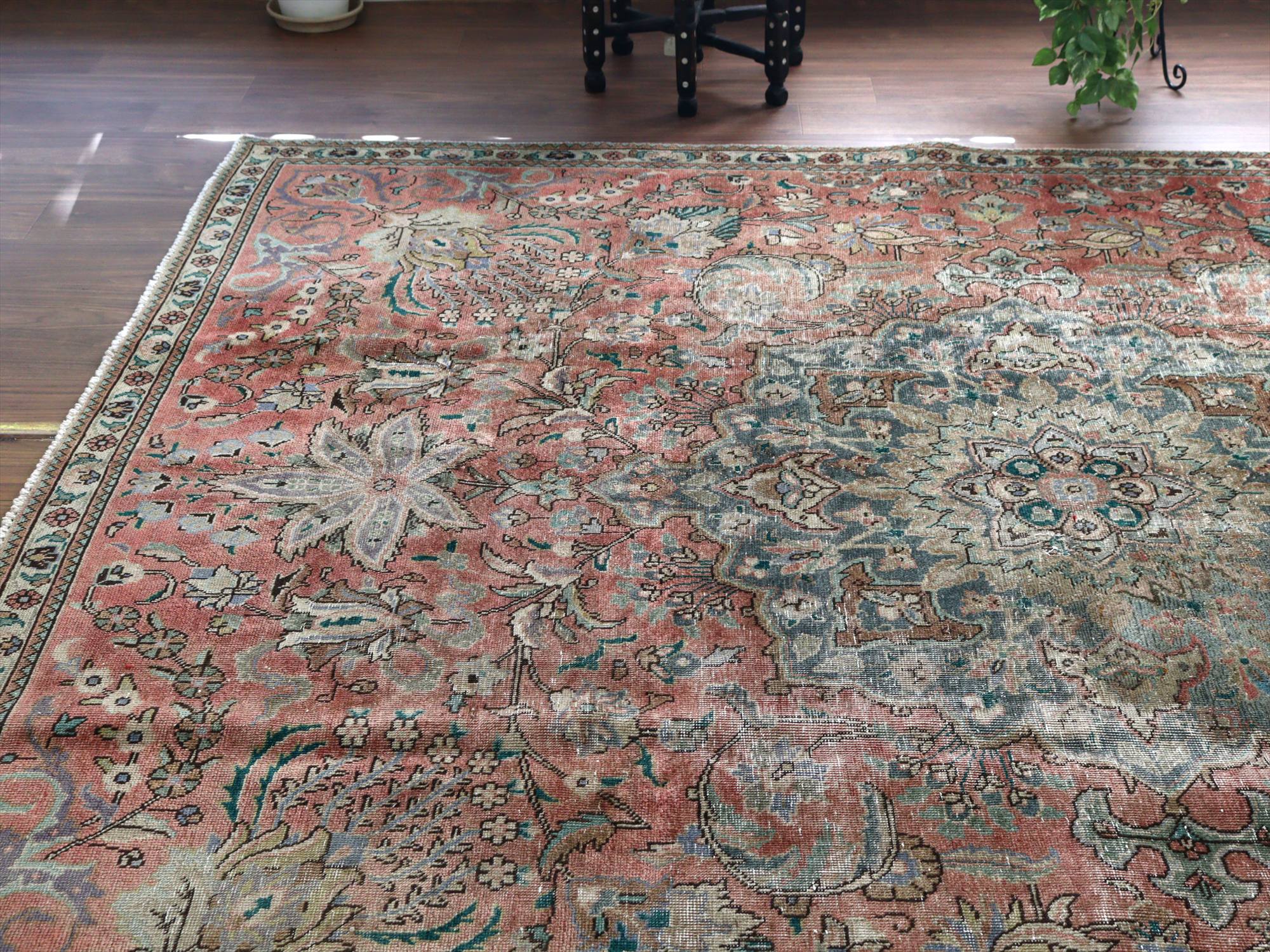 | ダメージが多く、使われなくなった古い手織りカーペットを、洗った上でブリーチをかけたユーズドラグです。全体的に色褪せた雰囲気がよく出ていて、しっとりと落ち着いた印象に仕上がっています。オリジナルの絨毯は、イラン北西部、タブリーズ地方のもので、大きなメダリオン柄です。 |
