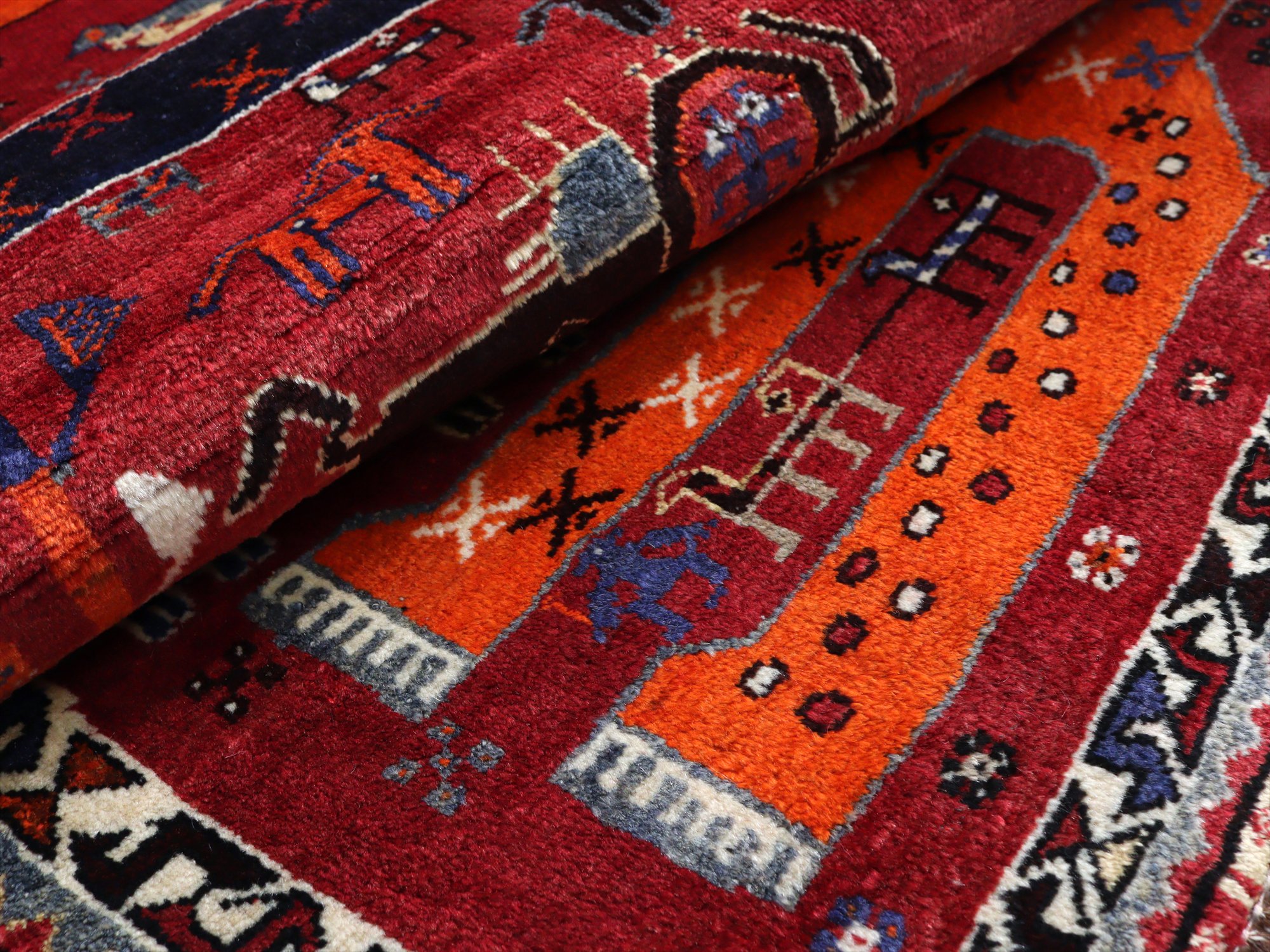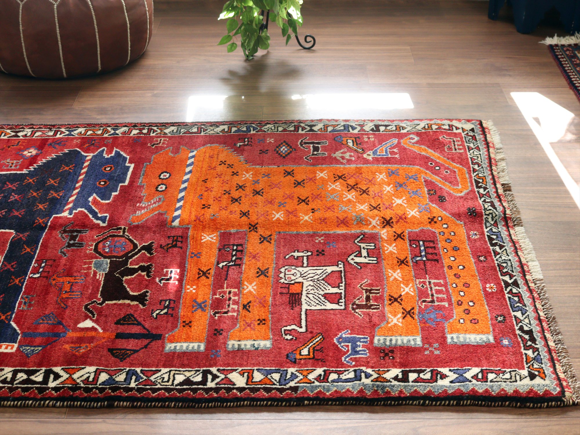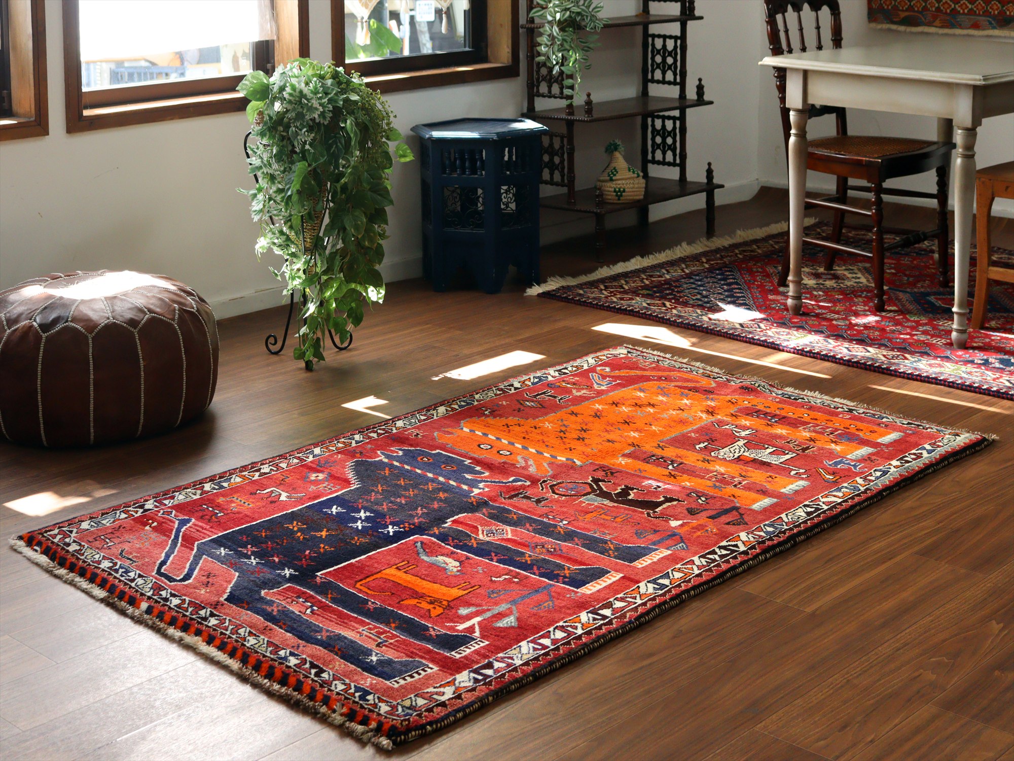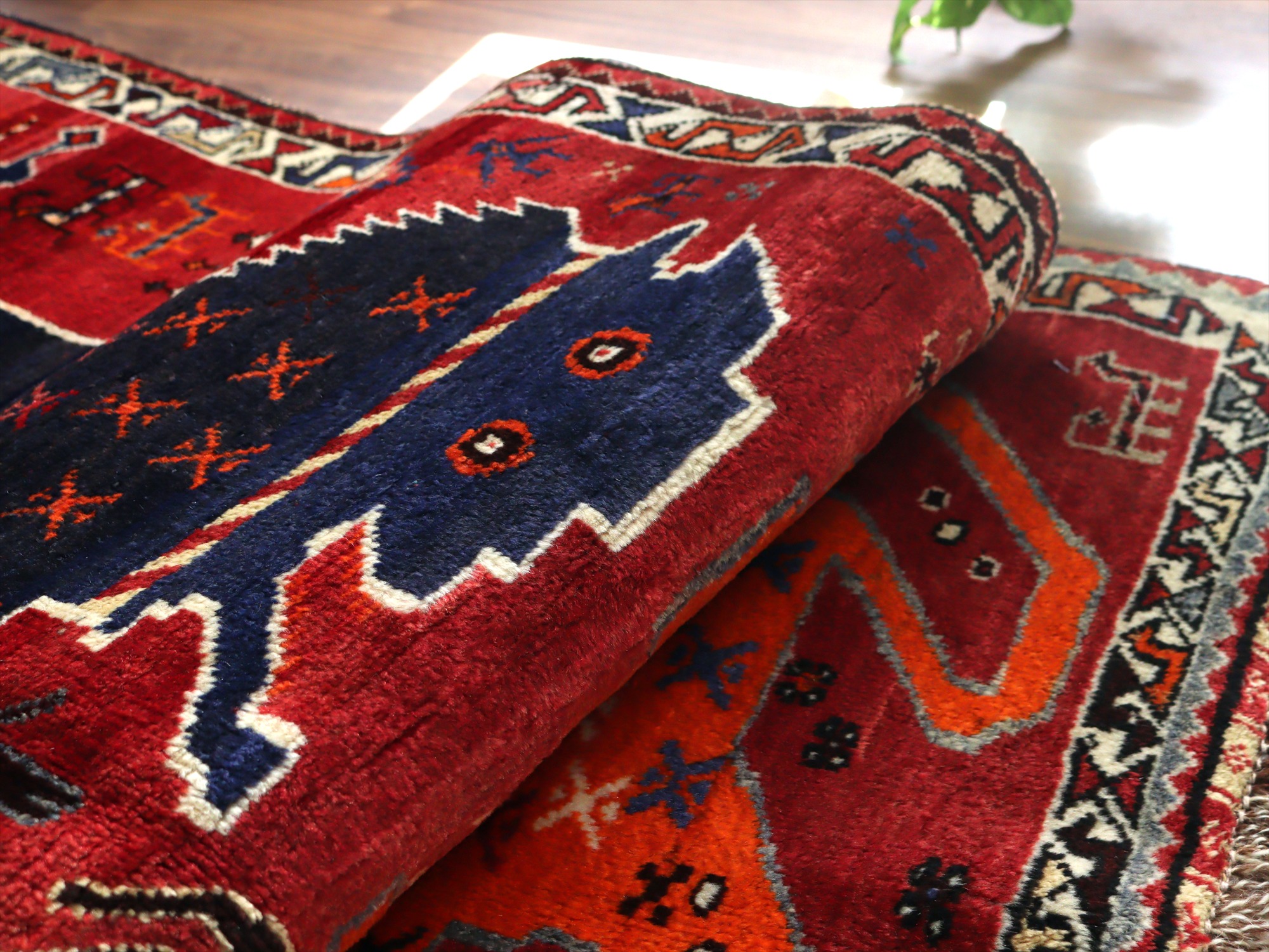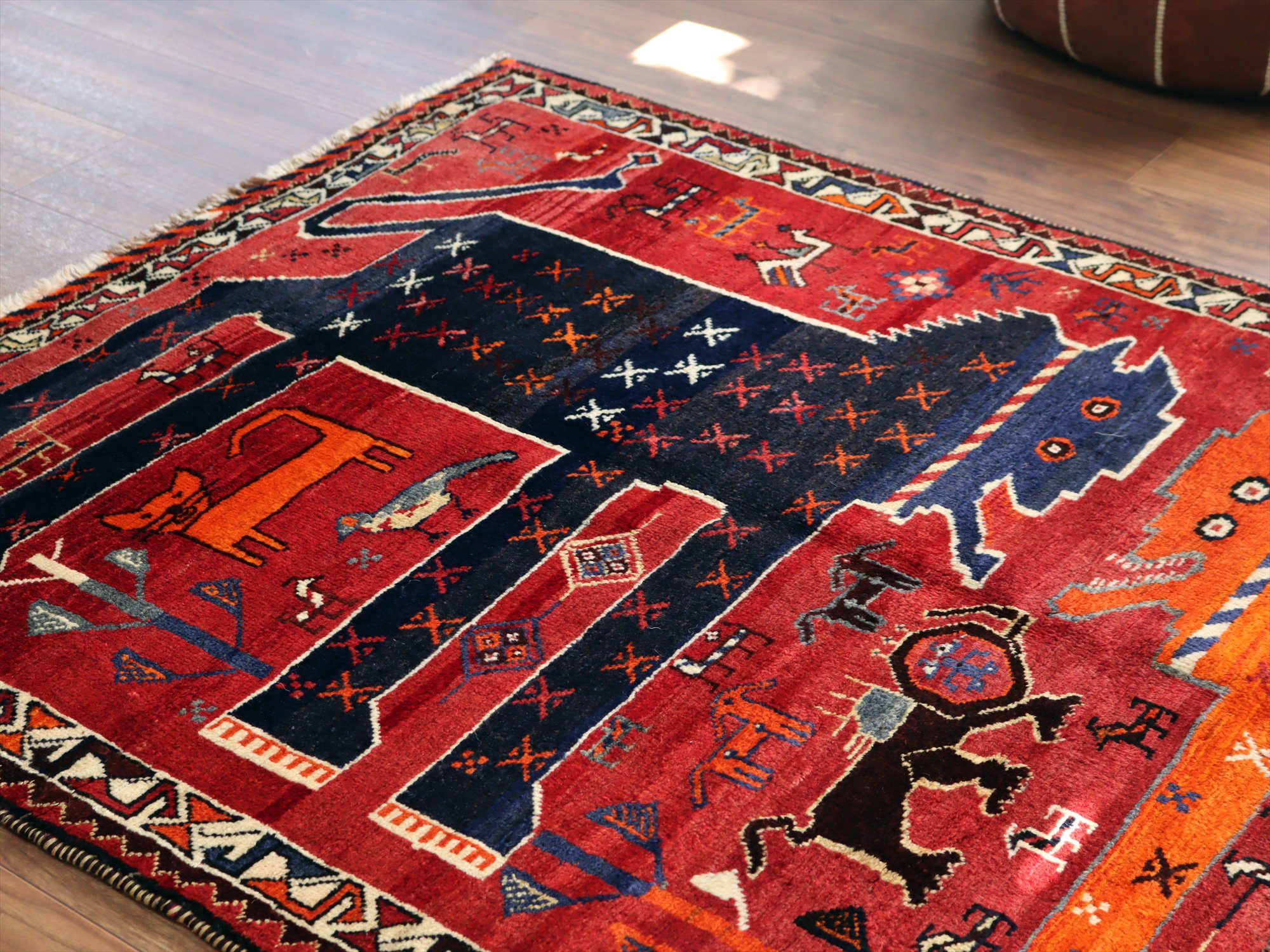 | 販売目的ではなく家庭で使うために織られたラグですが、保存状態がよくきれいな状態です。 カシュカイ族の象徴とされるライオンのモチーフですが、実際にはすでに絶滅してしまったライオンの姿を想像しながら、織り継がれてきたといいます。オールドライオンギャッベは、もともと販売のためではなく遊牧民たちが自分たちでテント(または部屋)で使うために織られたもの。生活の中で使用されていたものもあれば大切に保管してあったものもあり、状態は様々です。 現在では、職業として絨毯やギャベを織ることがほとんどで、ライオンギャッベのように遊牧民ならではの自由なデザインで織るユニークなカーペットは、21世紀に入ってから出てくる数が少なくなっています。 ここ数年、ユニークなオールドギャッベはマーケットに出てくることが少なくなり、だんだんと希少性が増してきています。ご興味のある方は、手に入るうちにぜひ!! |