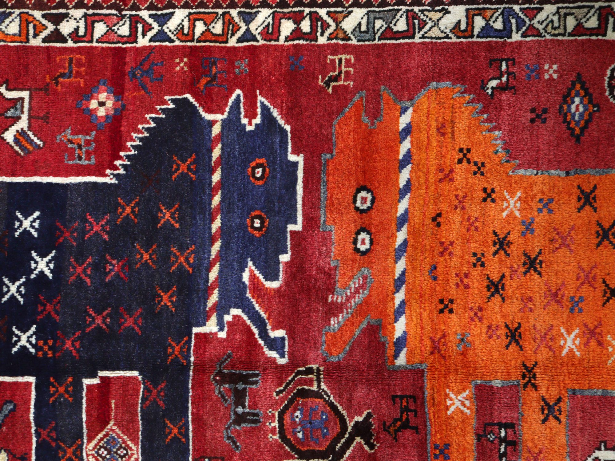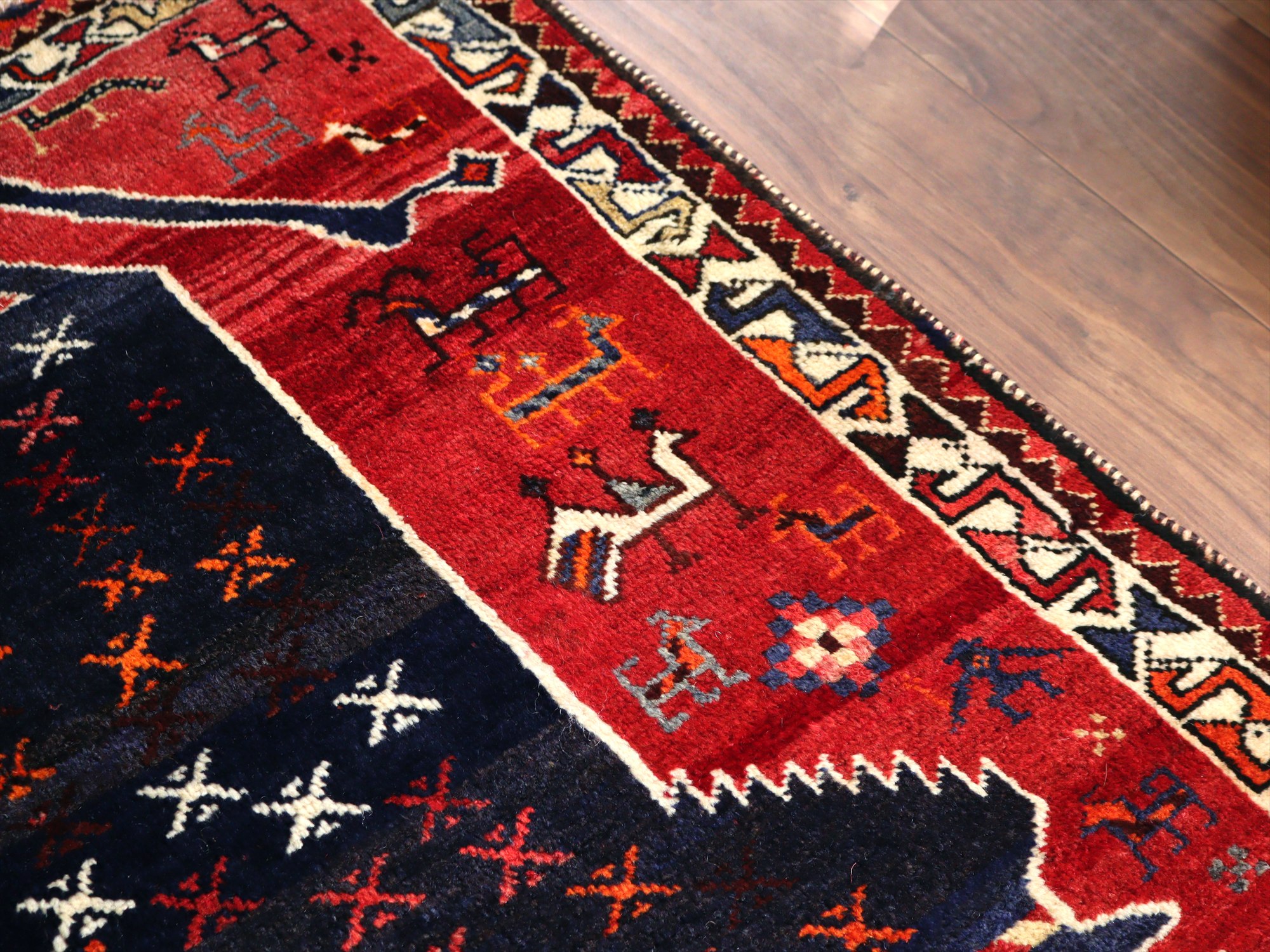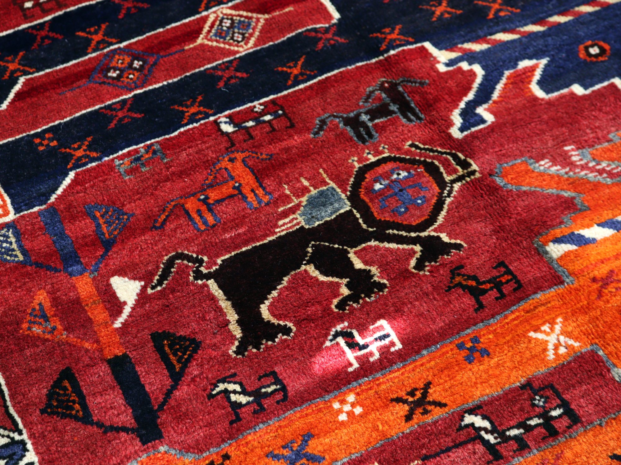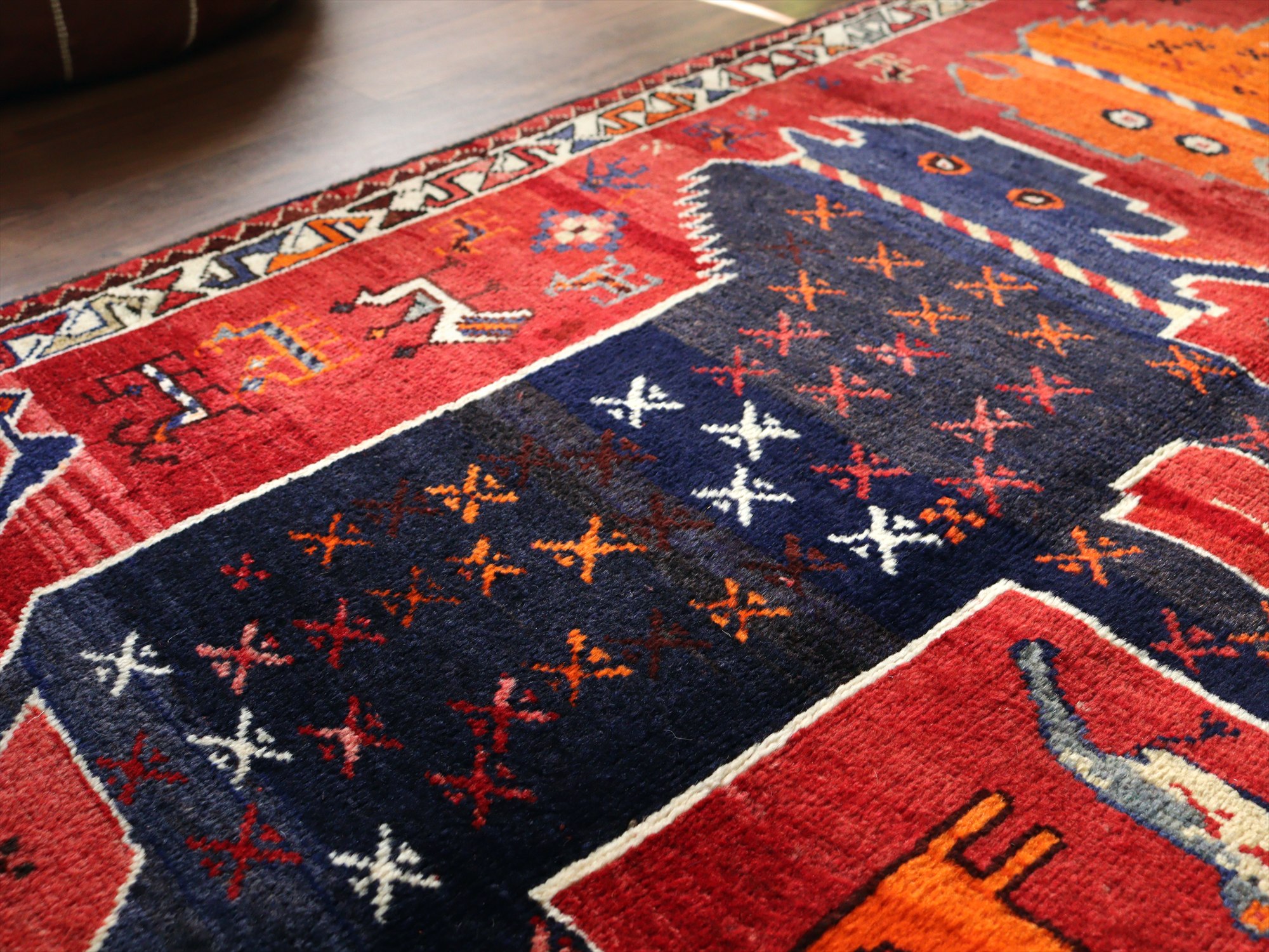 | ネイビーブルーとオレンジの2頭の大きなライオンが向かい合っているデザイン。隙間のフィールドには、サーベルを持ったライオンやヤギ、鳥、草花と多くのモチーフが織られています。 織られてから50年以上が経過したものと推測されます。もっとも特徴があるのは、ボーダー(額縁)デザインのさらに外側にもう一列別のパターンの飾りボーダーが織られているところで、近年商業用に織られているラグには見られないデザインです。 |