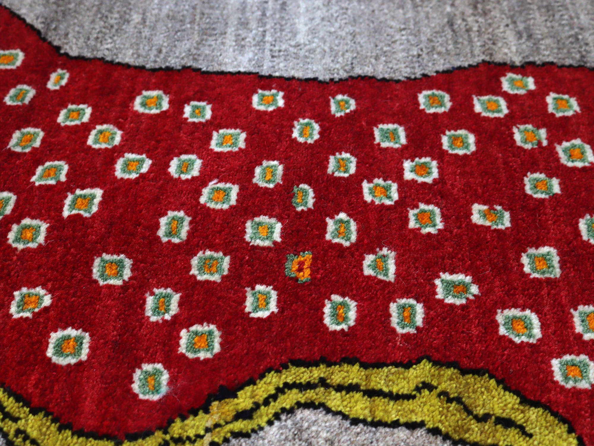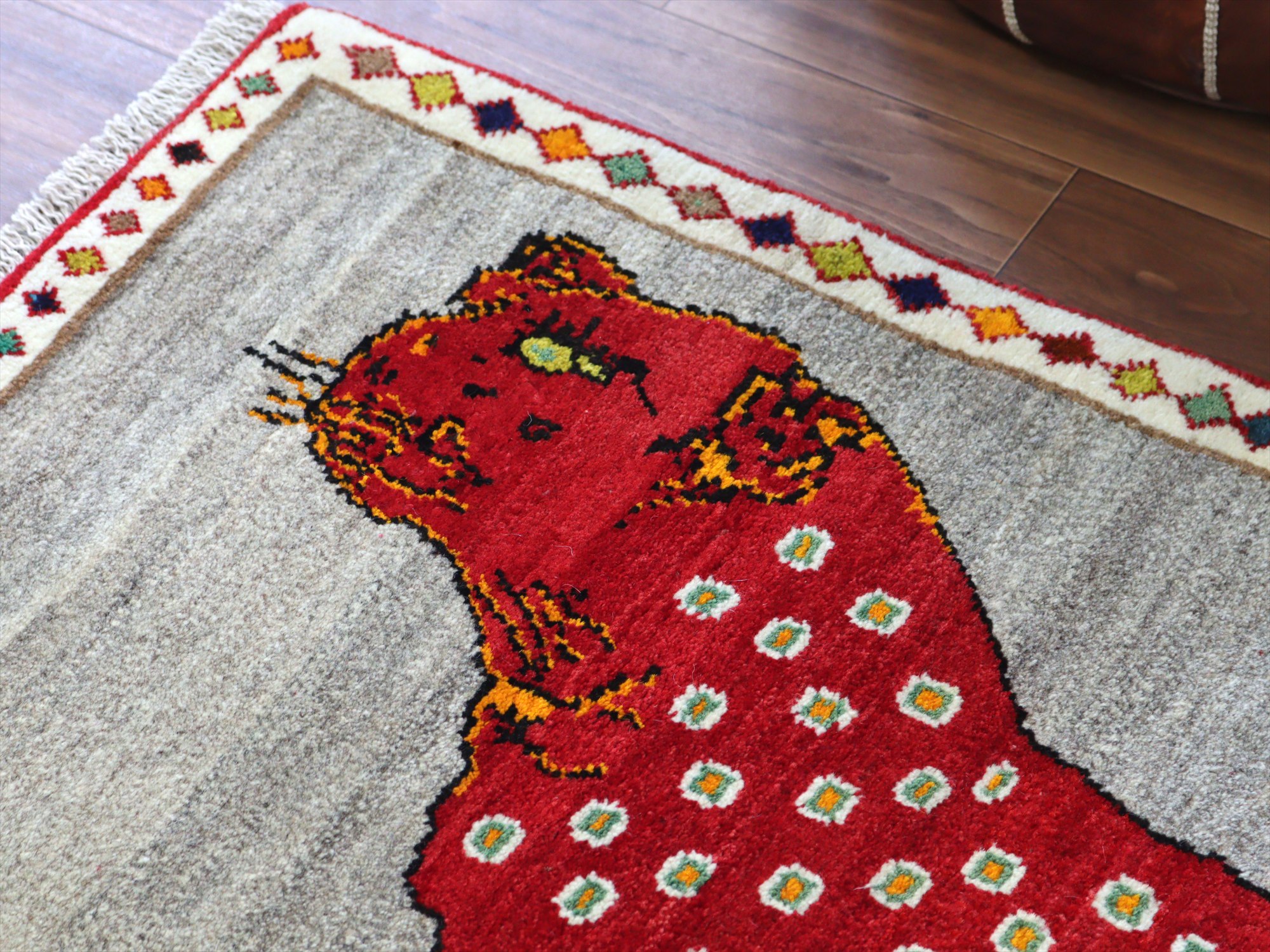 | カシュカイ族の象徴でもあるライオンとともに、よく登場するヒョウのデザイン(メスのライオンとも言われています)。グレーの水玉模様とクルンと丸まった尻尾がオシャレです。 玄関マットにも使いやすい横長のデザインとあわせやすいコンパクトなサイズです。ベースのグレーは、染めていない天然の羊毛の色が使われています。 |