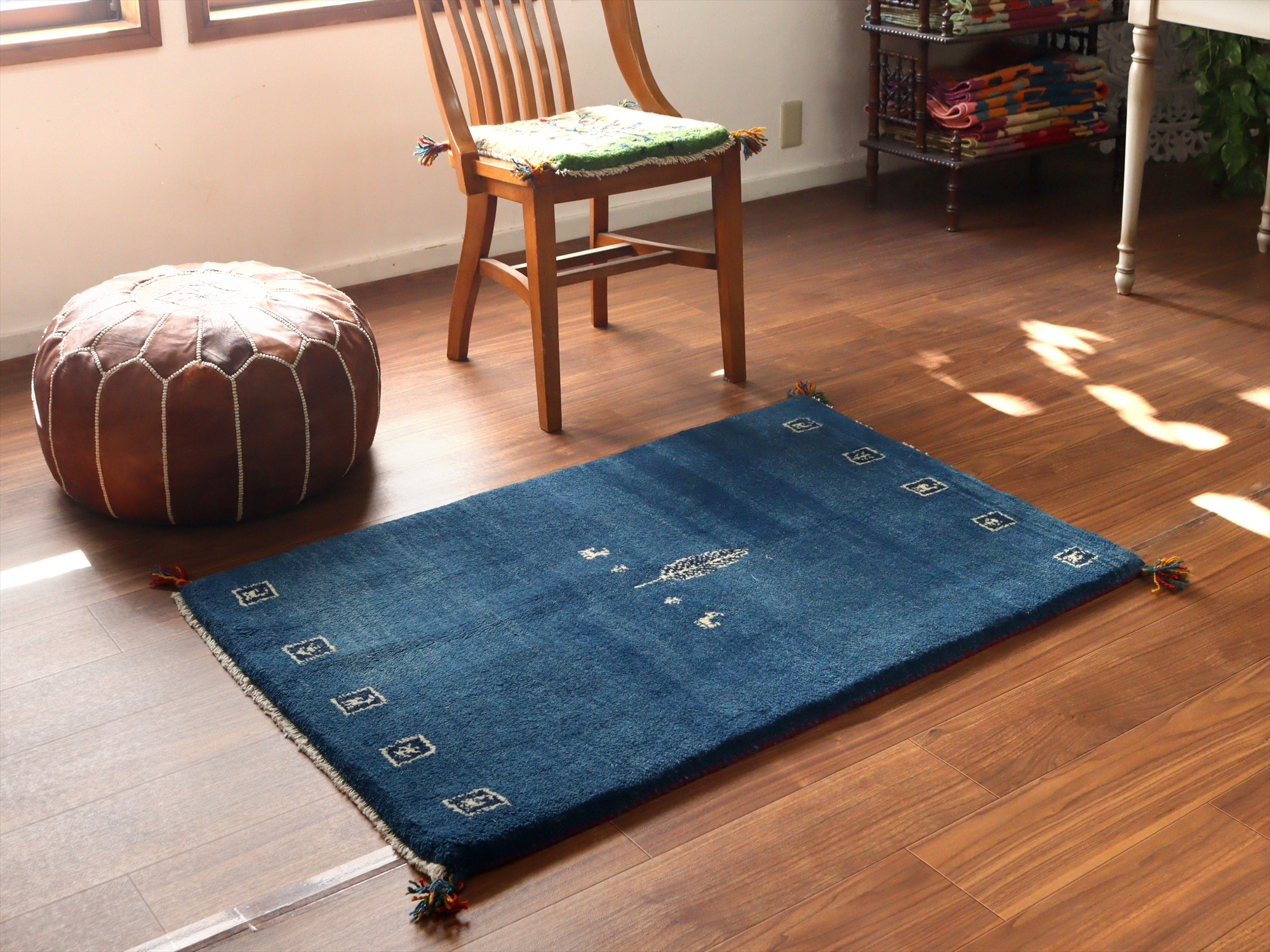 - イランの手織りラグ ギャッベ 118x80cm 動物と植物 ブルー