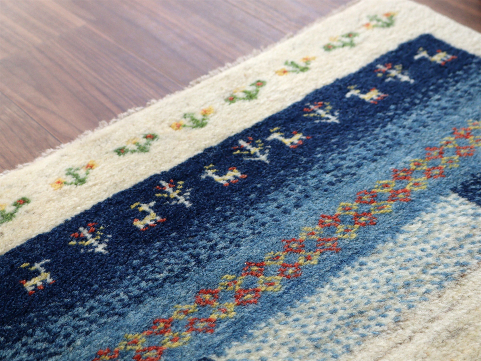 | ナチュラルアイボリーとネイビーを基調としたギャッベ。ブルーとネイビーのベースには、イエローやレッドの色糸で、小花や動物などが織られていてよく映えています。 |