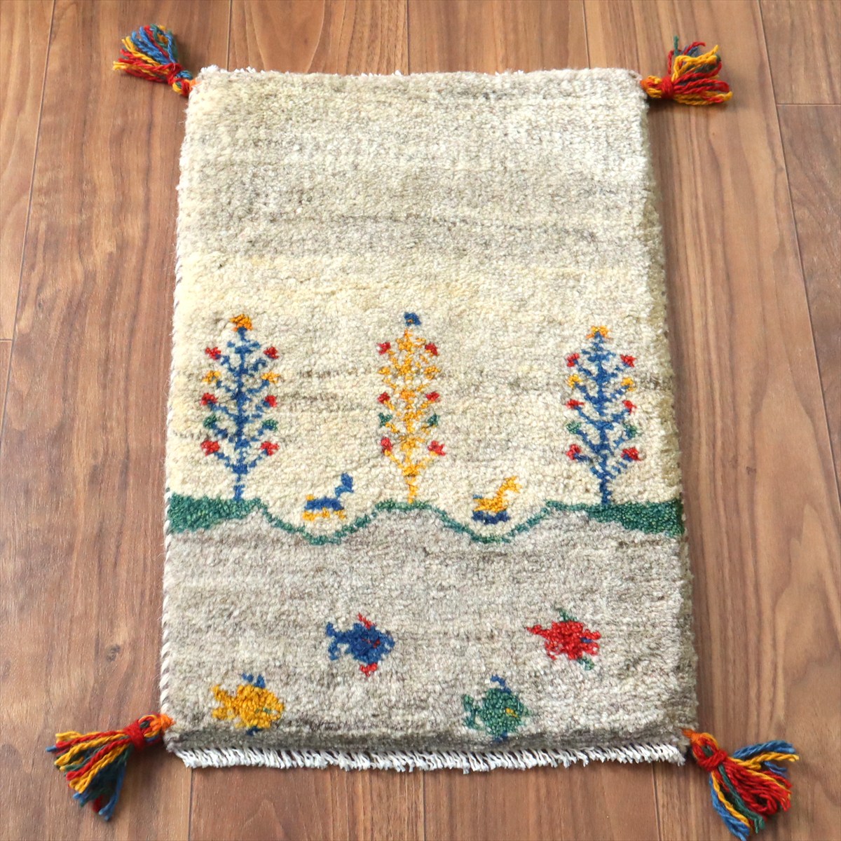 ギャッベ ミニギャベ イラン手織り 58×37cm ナチュラルアイボリー 生命の樹と魚と動物