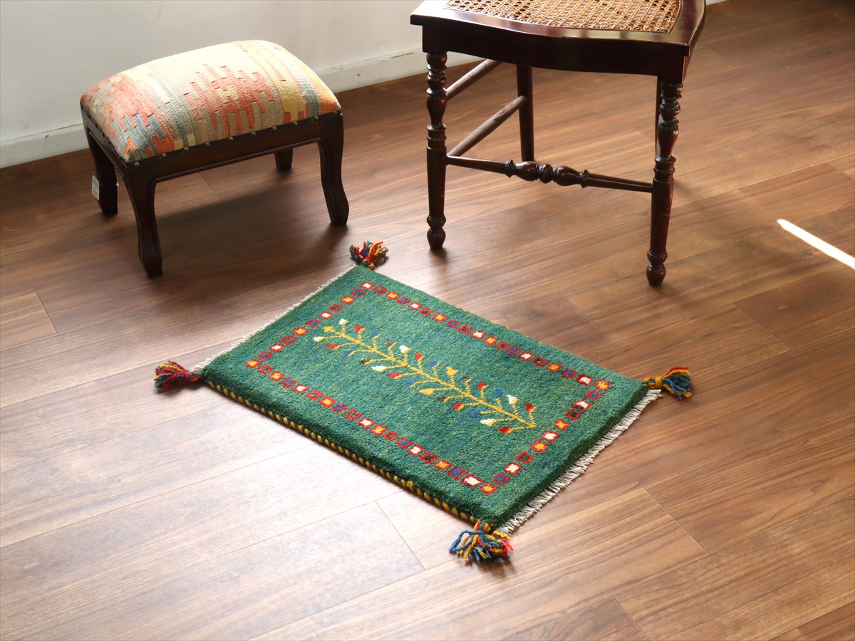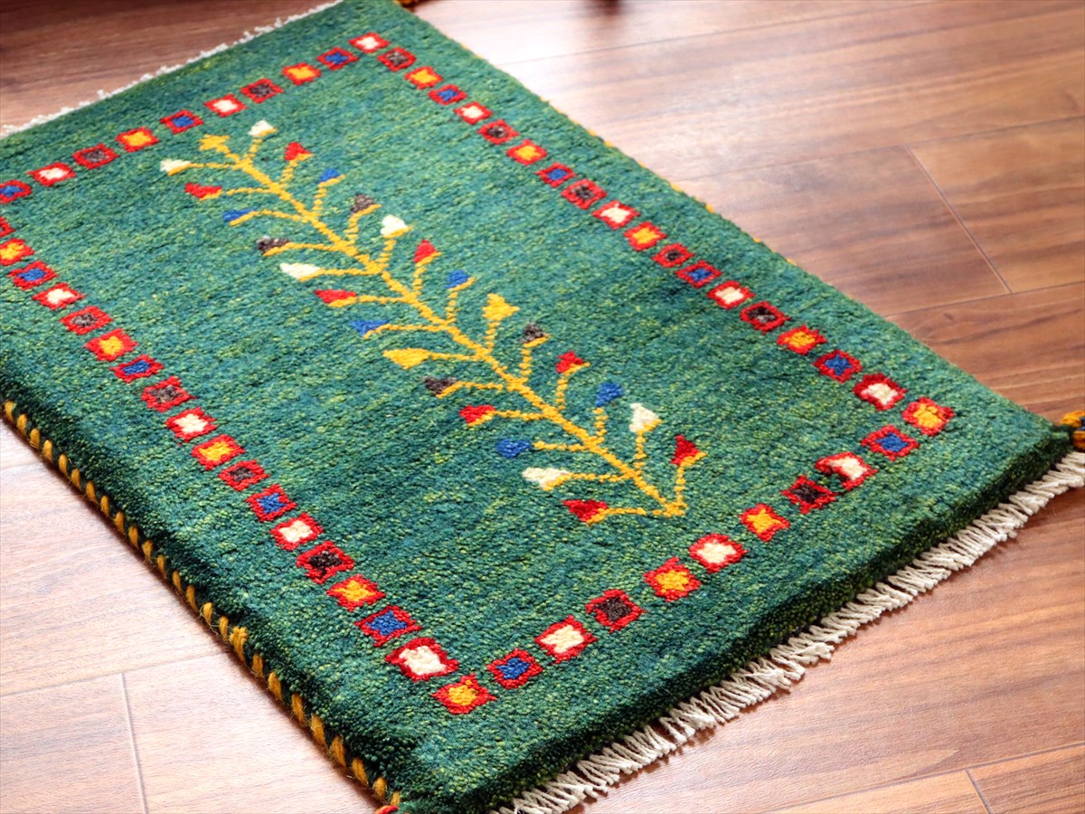 ギャッベ ミニギャベ イラン手織り 58×40cm グリーン 連なる生命とカラフルタイル