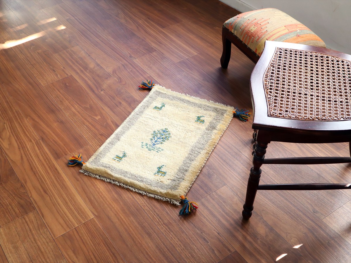 ギャッベ ミニギャベ イラン手織り 56×42cm ナチュラルアイボリー 動物と生命の樹
