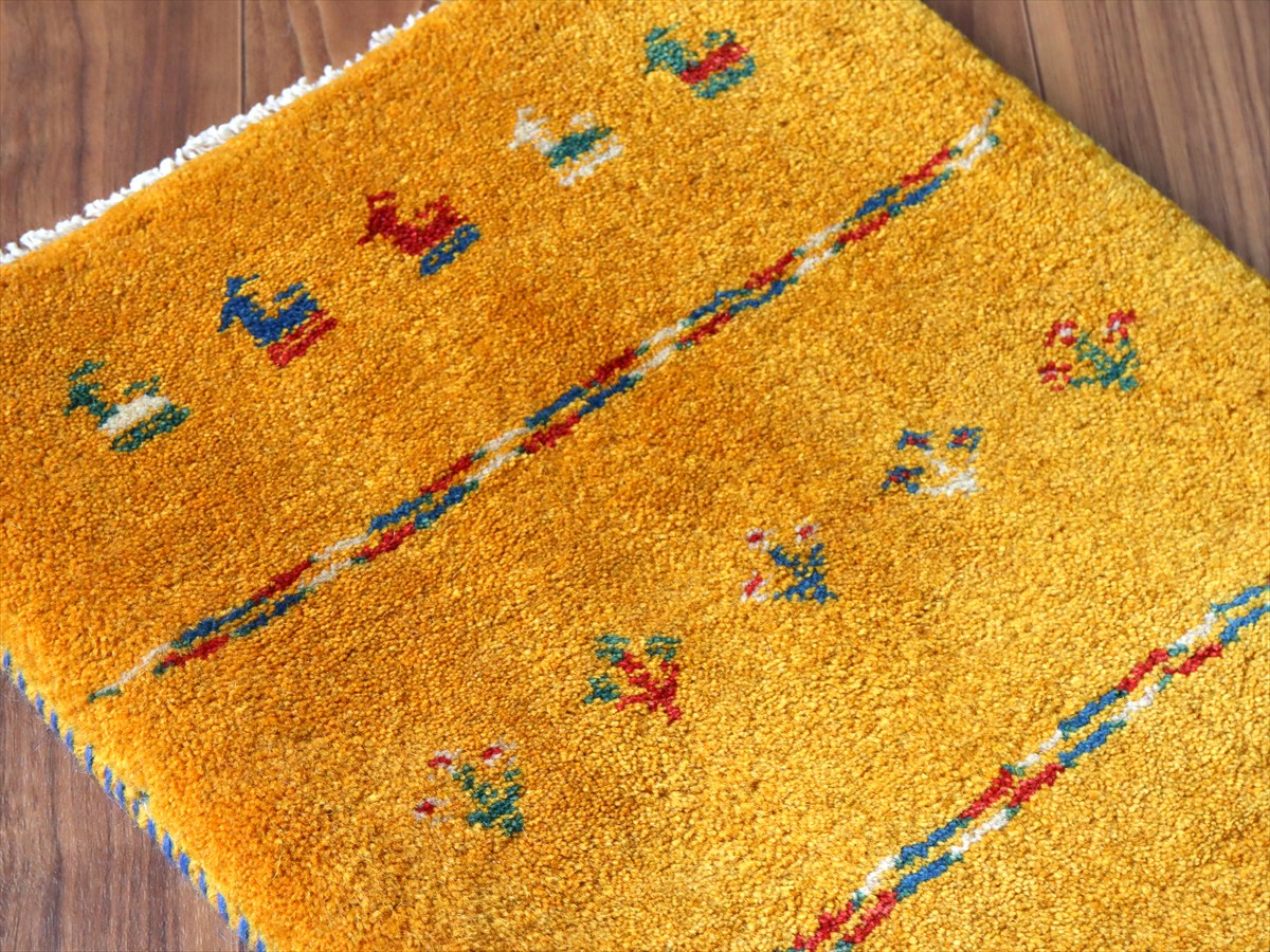 Key:ギャッベ,ギャベ,一点もの 現品販売 ラグ,ウール製,イラン,手織り,じゅうたん,絨毯,座布団, イエロー オレンジ 黄色 草木染, ガラタバザール Gabbeh, Handmade, Hand knotted, Tribal rug, Iran carpet, Wool, Natural Dye,