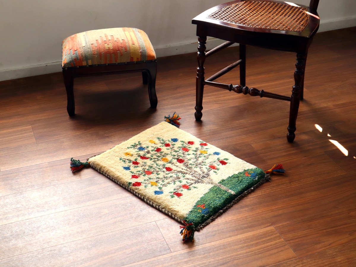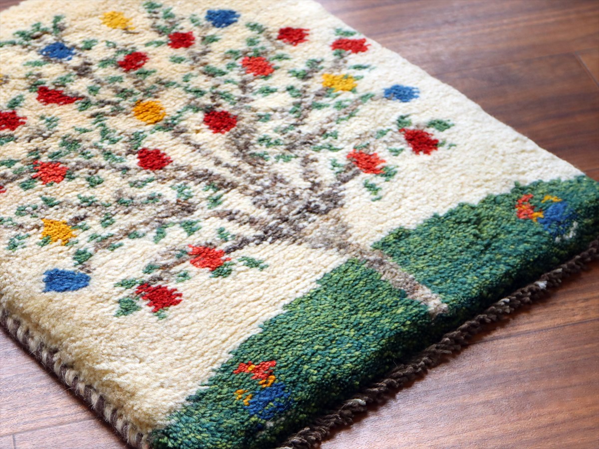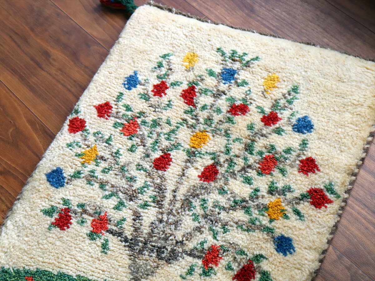 - ギャッベ ミニギャベ イラン手織り 53×41cm ナチュラルアイボリー 生命の樹とザクロと動物