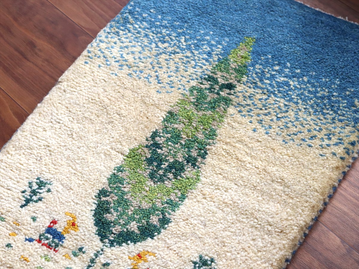 | 天然の羊毛の色をそのまま使ったアイボリーのギャッベ。ところどころグレーやベージュの毛糸も混ざっています。空をイメージしたブルーと糸杉が織られています。糸杉は長寿を願う意味を持っていて、ギャベでは多用されるモチーフのひとつです。動物モチーフも織られています。 |
