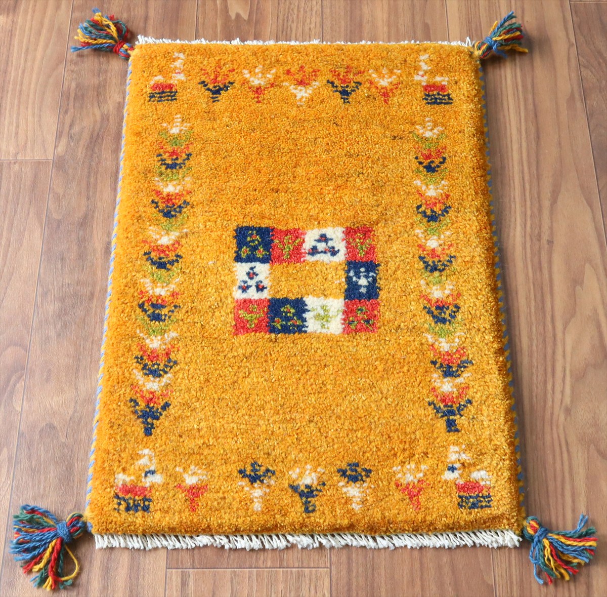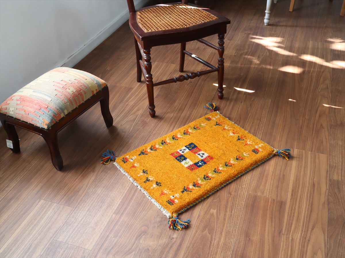 Key:ギャッベ,ギャベ,一点もの 現品販売 ラグ,ウール製,イラン,手織り,じゅうたん,絨毯,座布団, イエロー オレンジ 黄色 草木染, ガラタバザール Gabbeh, Handmade, Hand knotted, Tribal rug, Iran carpet, Wool, Natural Dye,