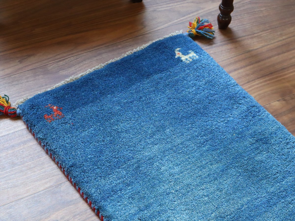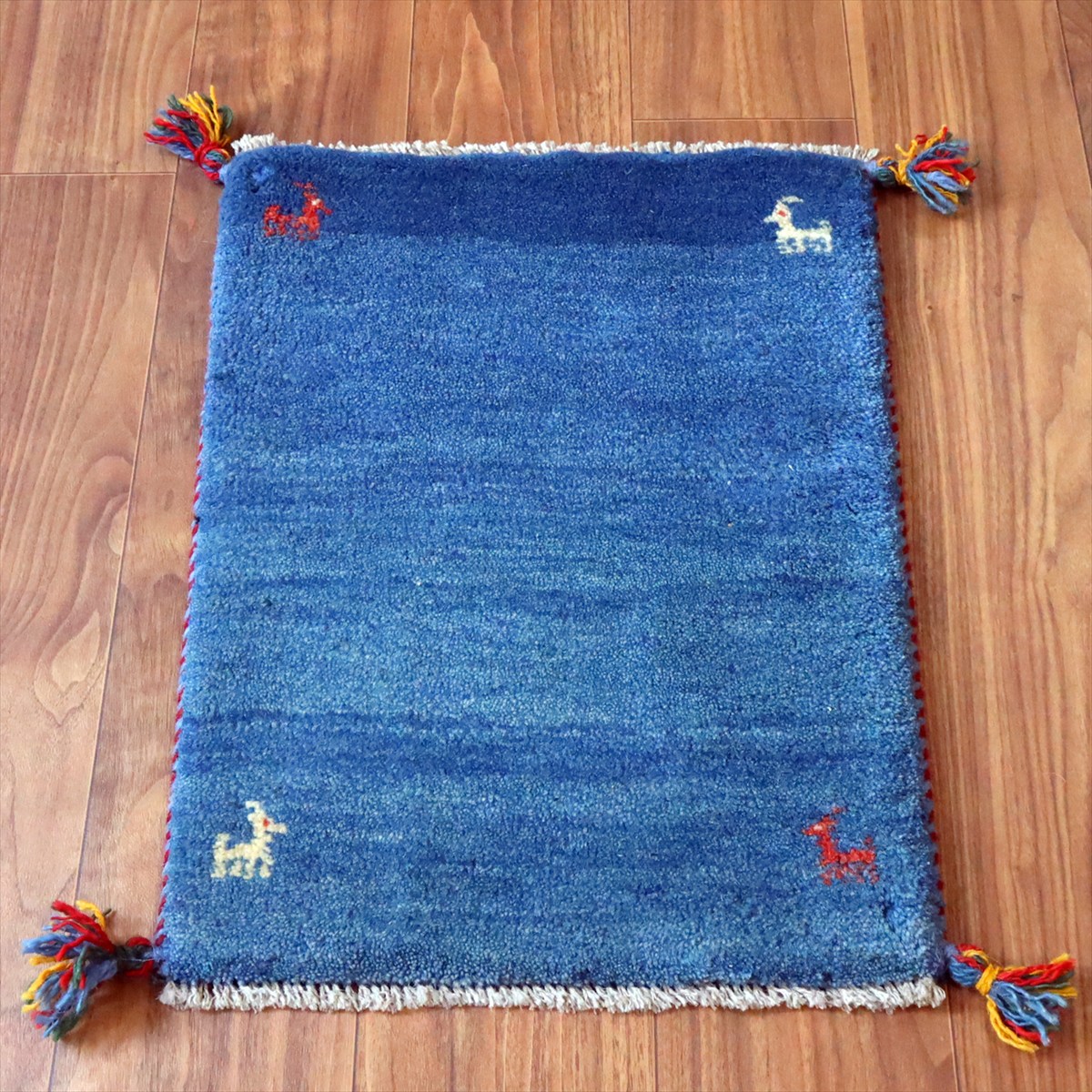 ギャッベ ミニギャベ イラン手織り 57×41cm ブルー 四隅に動物