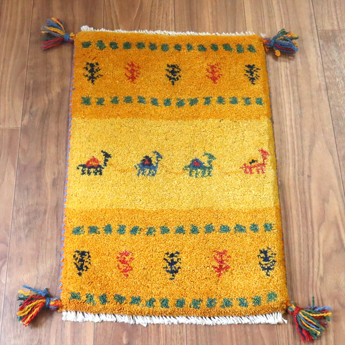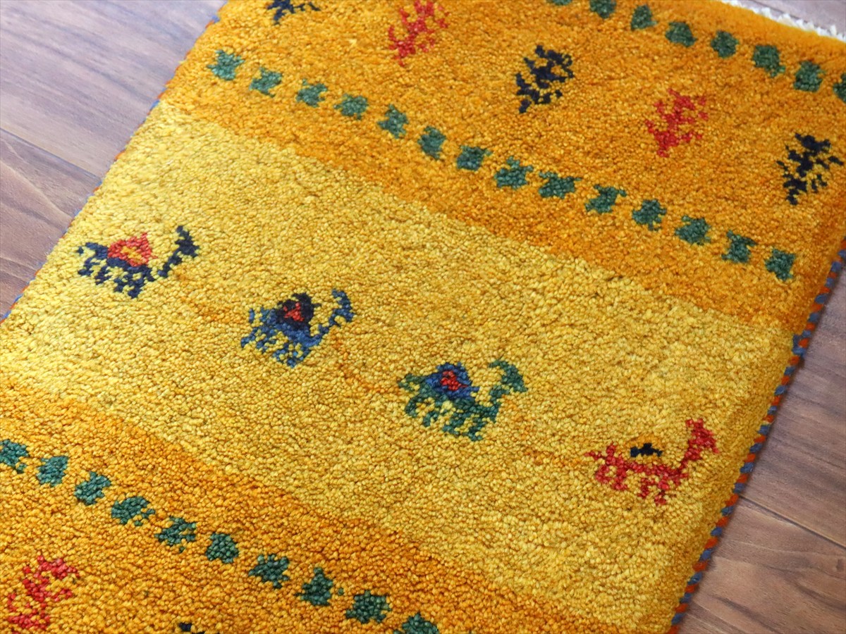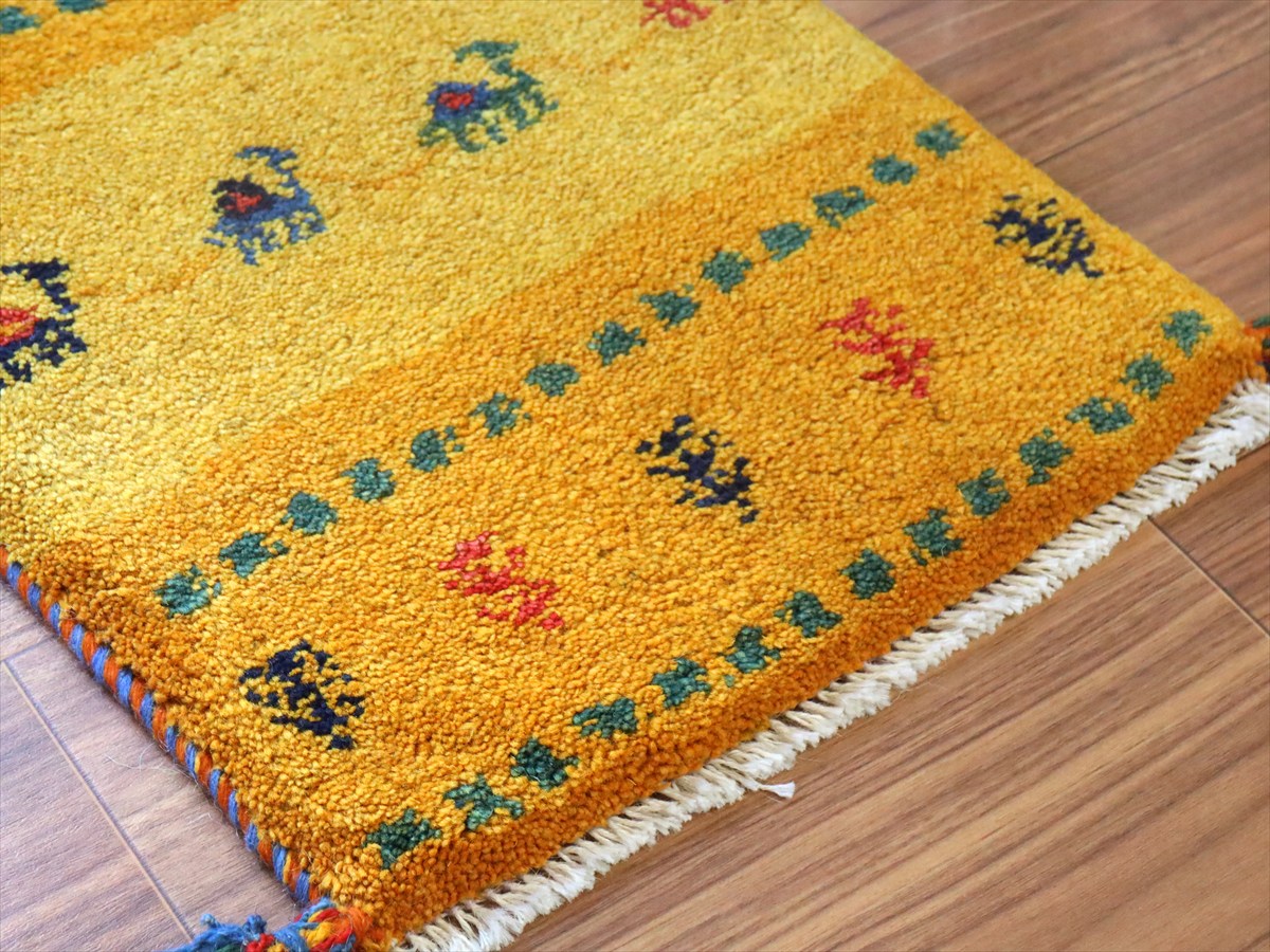 Key:ギャッベ,ギャベ,一点もの 現品販売 ラグ,ウール製,イラン,手織り,じゅうたん,絨毯,座布団, イエロー オレンジ 黄色 草木染, ガラタバザール Gabbeh, Handmade, Hand knotted, Tribal rug, Iran carpet, Wool, Natural Dye,