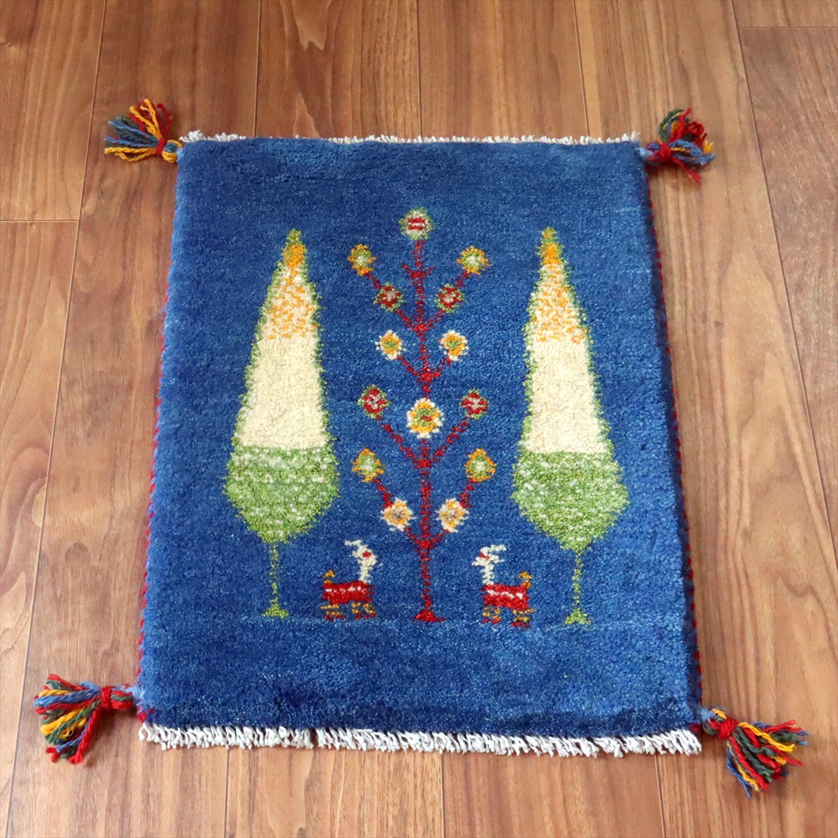 - ギャッベ ミニギャベ イラン手織り 55×42cm ブルー 糸杉と生命の樹と動物