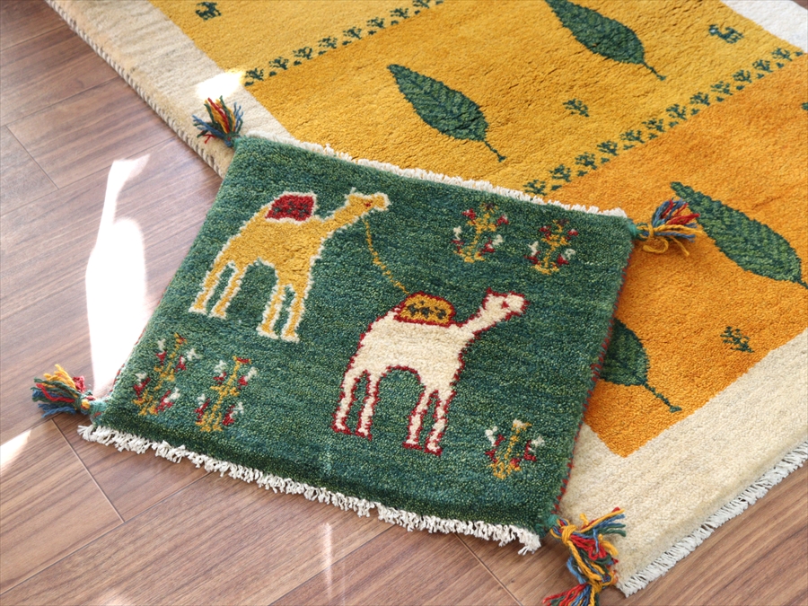 ギャッベ イラン産手織り 座布団サイズ 40x47cm グリーン 2頭のラクダ