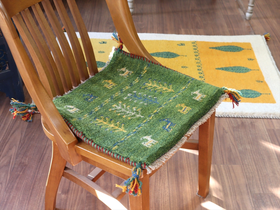 ギャッベ イラン産手織り 座布団サイズ 39x43cm 明るいグリーン