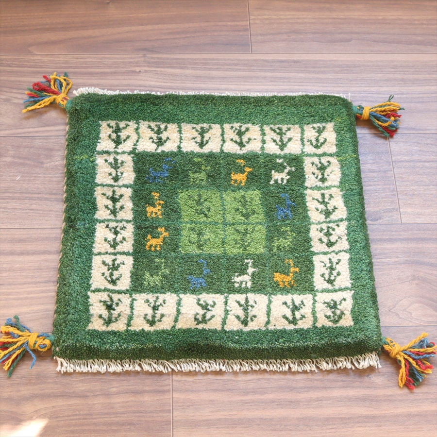 ギャッベ イラン産手織り 座布団サイズ 41x41cm グリーン タイルデザイン