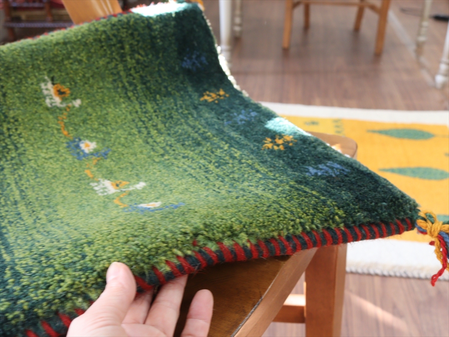 Key:イラン直輸入, GABBEH, ギャッベ, ギャベ, グリーン, 緑, 手織り, 手紡ぎ, ウール, 天然素材, ポンポン, 座布団, バザールギャッベ, ハンドメイド, 一点もの, 現品販売,ガラタバザール, 東京中野区