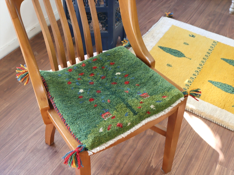 ギャッベ イラン産手織り 座布団サイズ 37x40cm グリーン ザクロの実をつけた生命の木