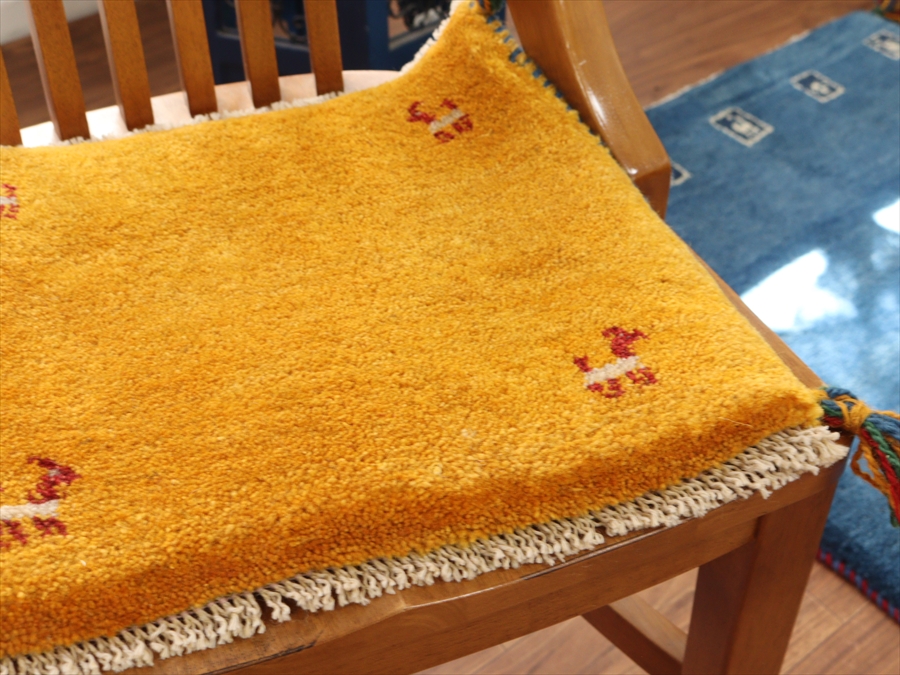 ギャッベ イラン産手織り 座布団サイズ 35x42cm イエローオレンジ シンプル 無地 動物モチーフ