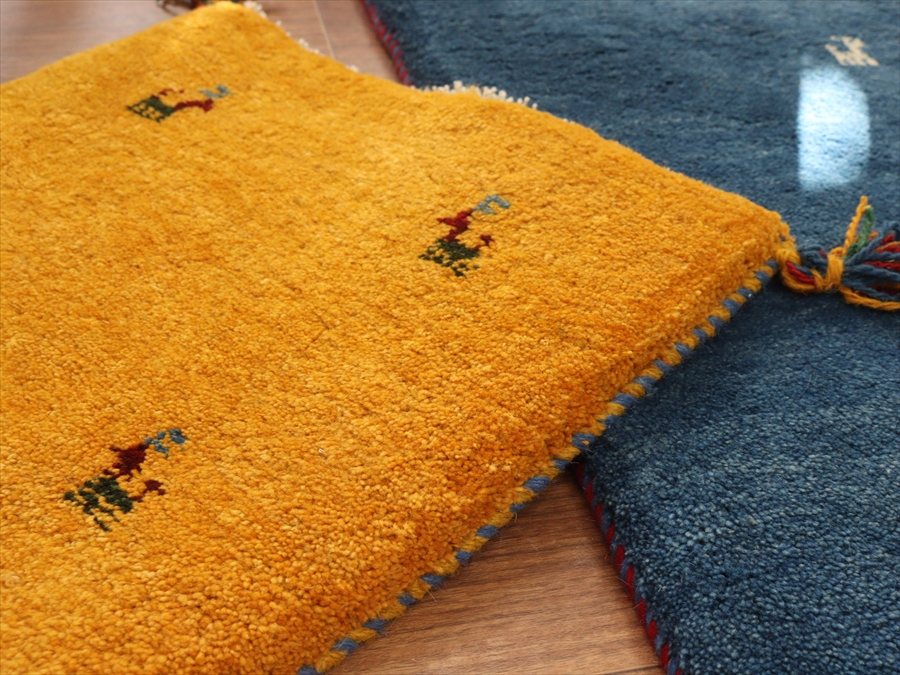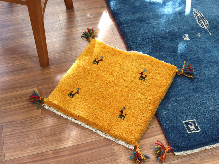 ギャッベ イラン産手織り 座布団サイズ 40x42cm イエローオレンジ シンプル 無地 動物モチーフ