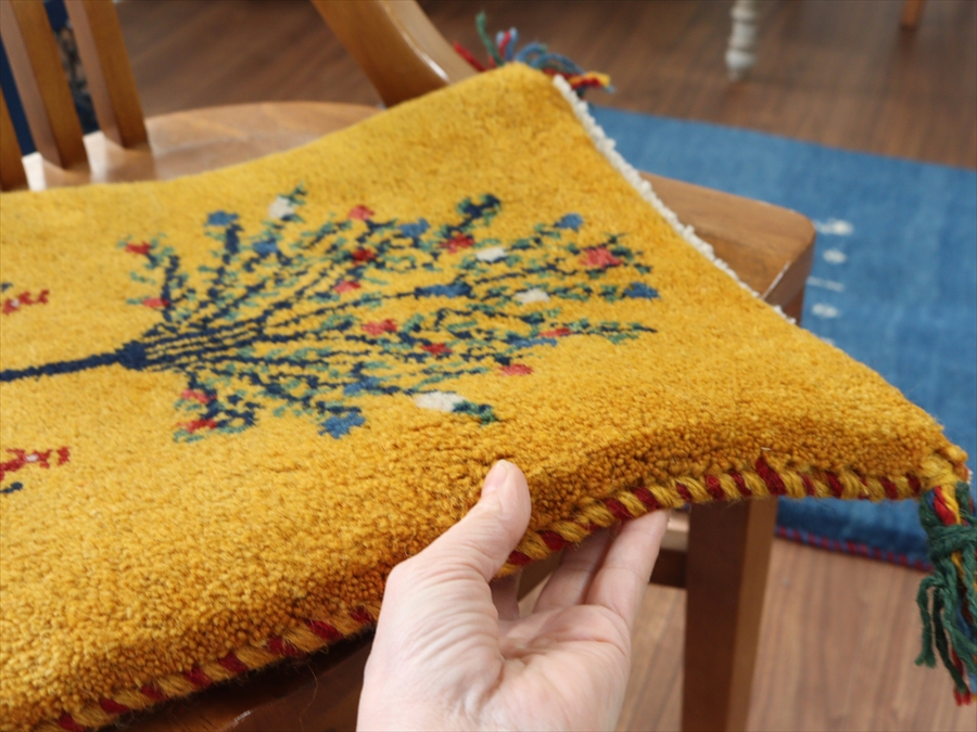 - ギャッベ イラン産手織り 座布団サイズ 38x39cm イエロー 花をつけた生命の木