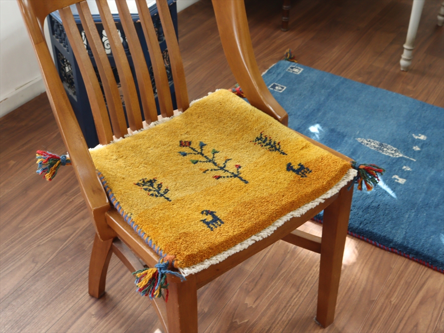 ギャッベ イラン産手織り 座布団サイズ 38x41cm イエローオレンジ 草花と動物
