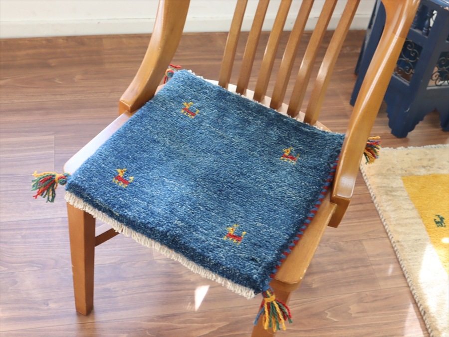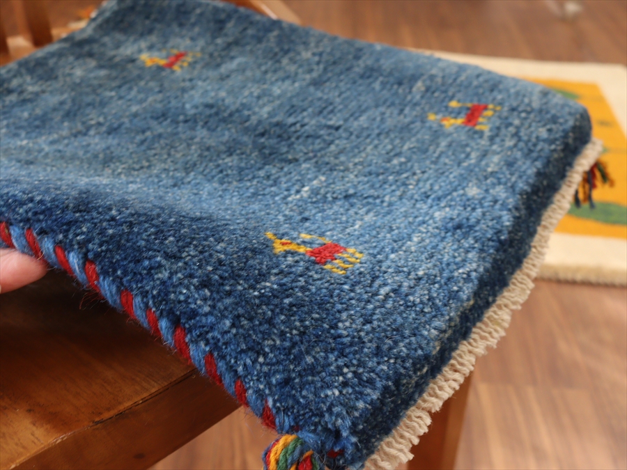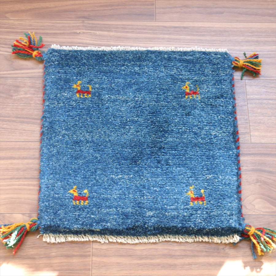 ギャッベ イラン産手織り 座布団サイズ 41x39cm ブルー 無地 シンプル