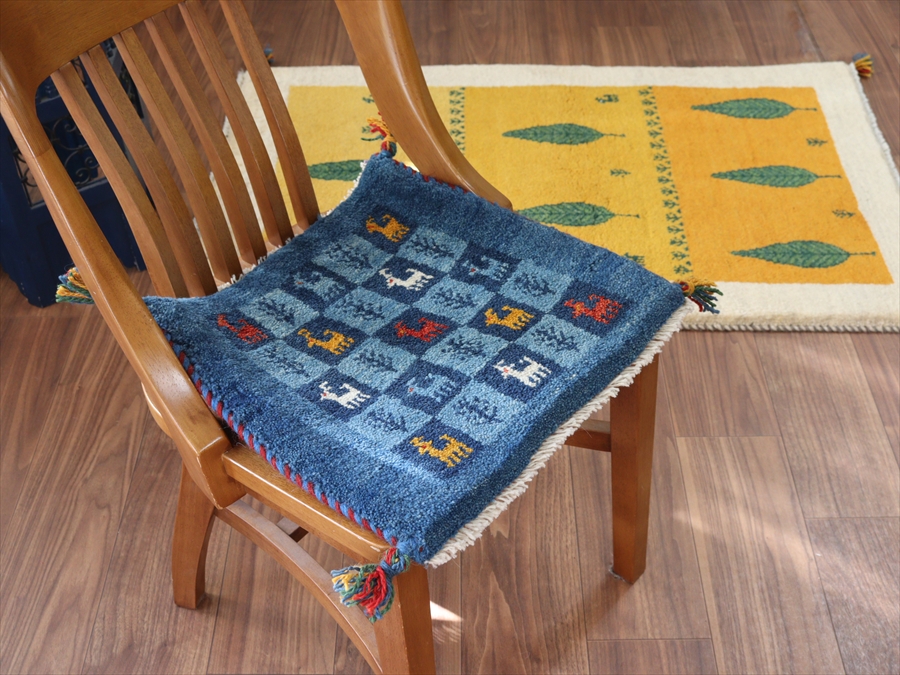 ギャッベ イラン産手織り 座布団サイズ 40x43cm ブルー 市松模様 タイル