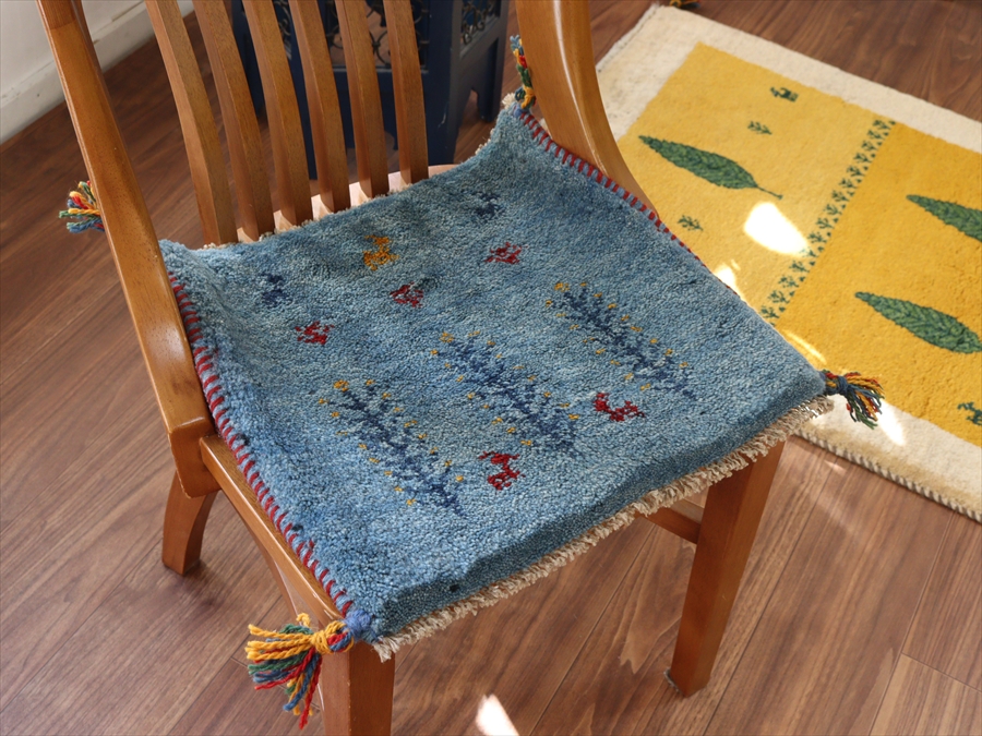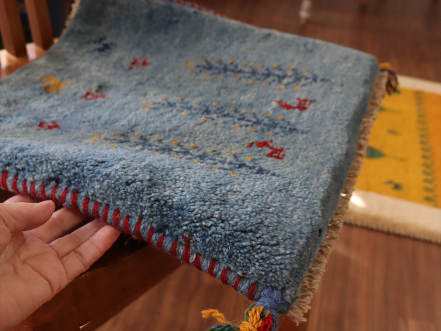 ギャッベ イラン産手織り 座布団サイズ 40x44cm 明るいブルー 生命の木と動物
