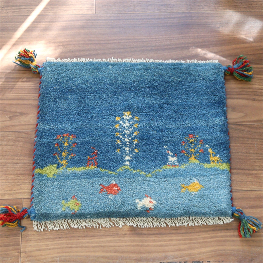 ギャッベ イラン産手織り 座布団サイズ 36x42cm ブルー 魚のいる湖