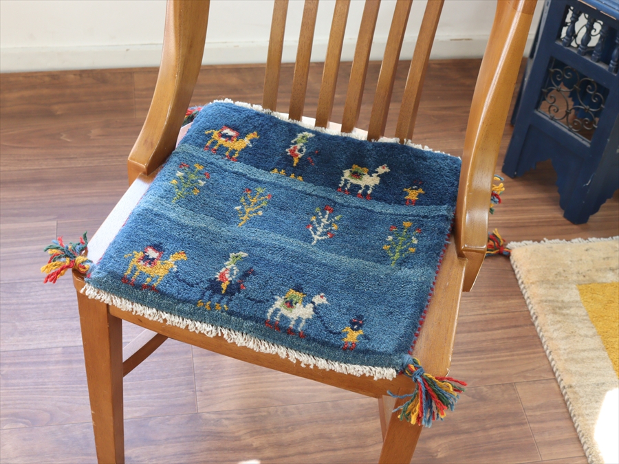 ギャッベ イラン産手織り 座布団サイズ 39x39cm ブルー ラクダの隊商