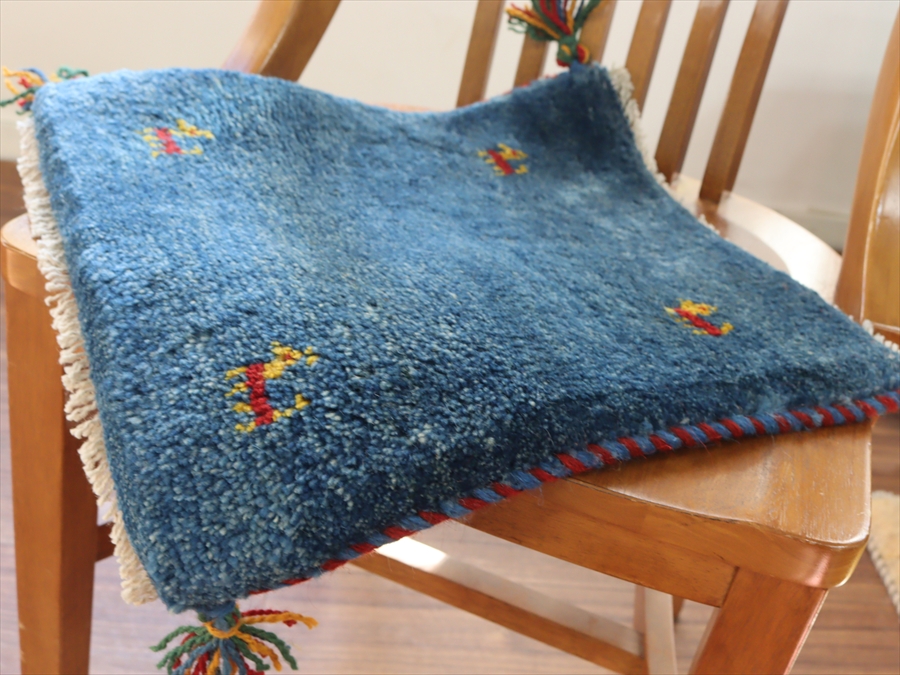ギャッベ イラン産手織り 座布団サイズ 41x40cm ブルー 無地 シンプル
