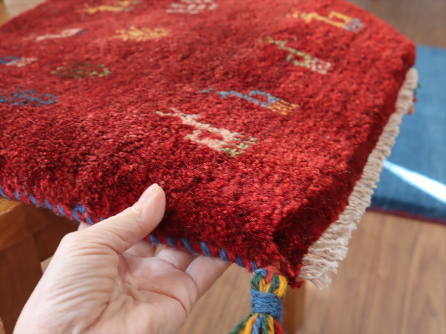 ギャッベ イラン産手織り 座布団サイズ 41x42cm レッド 動物と草花モチーフ シンプル