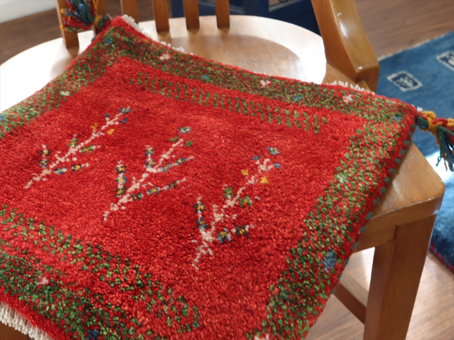 ギャッベ イラン産手織り 座布団サイズ 41x40cm レッド グリーンボーダー 草花のモチーフ