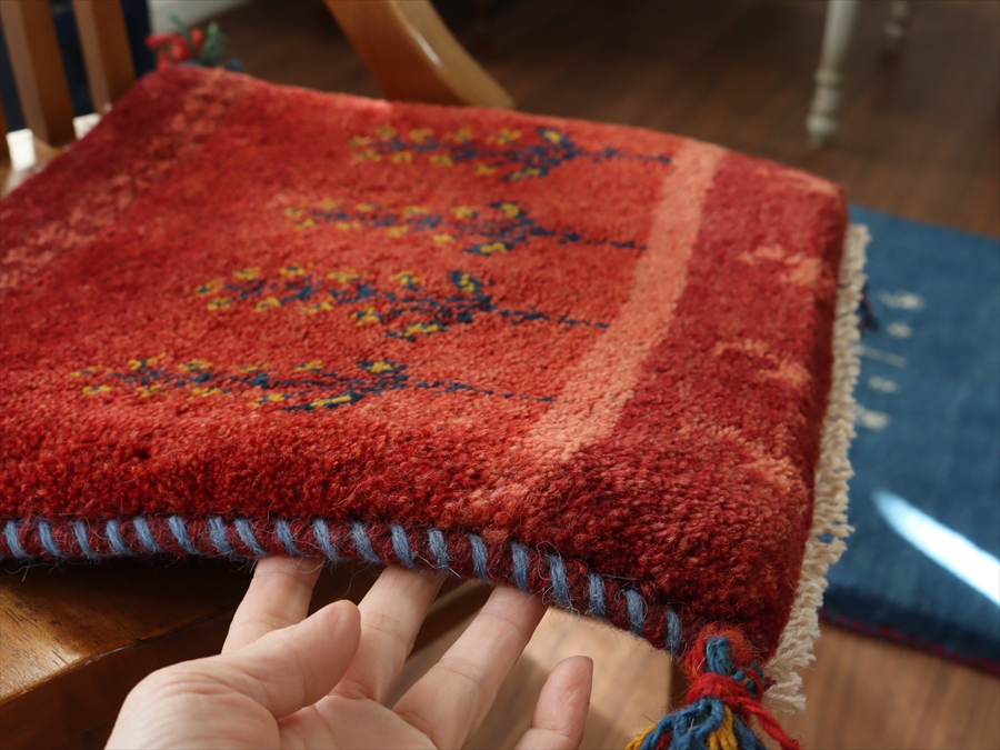 | 何枚も集めたくなる、40cm角の座布団サイズギャベ。四隅に大きなポンポンのついた、伝統的なスタイルでおられています。フローリングに並べて座布団がわりに使ったり、ベンチやダイニングチェアの座面など、使い方はいろいろ。壁にタペストリーのように飾るのもおすすめです。 |