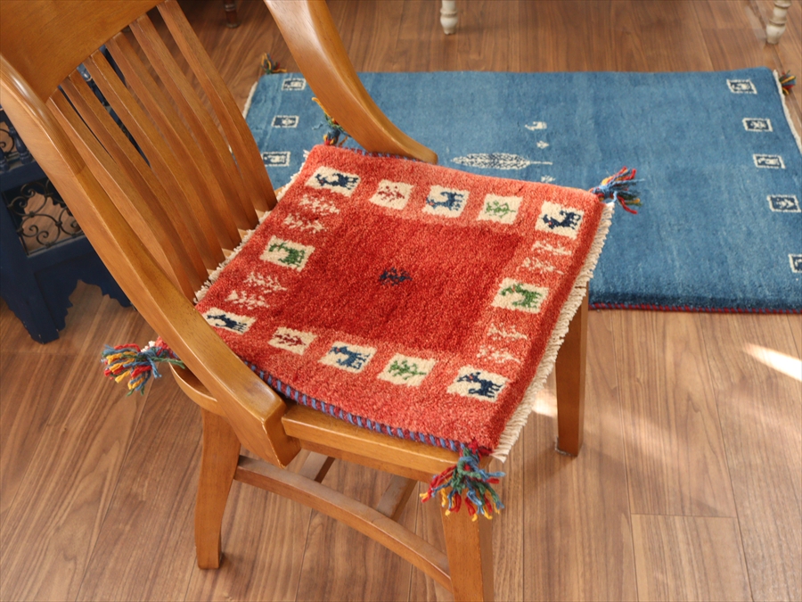 | 何枚も集めたくなる、40cm角の座布団サイズギャベ。四隅に大きなポンポンのついた、伝統的なスタイルでおられています。フローリングに並べて座布団がわりに使ったり、ベンチやダイニングチェアの座面など、使い方はいろいろ。壁にタペストリーのように飾るのもおすすめです。 |