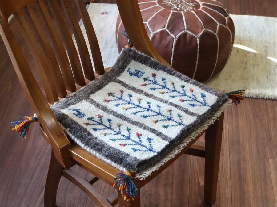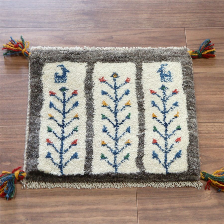 ギャッベ イラン産手織り 座布団サイズ 38x42cm ナチュラルアイボリー&グレー 花をつけた生命の木